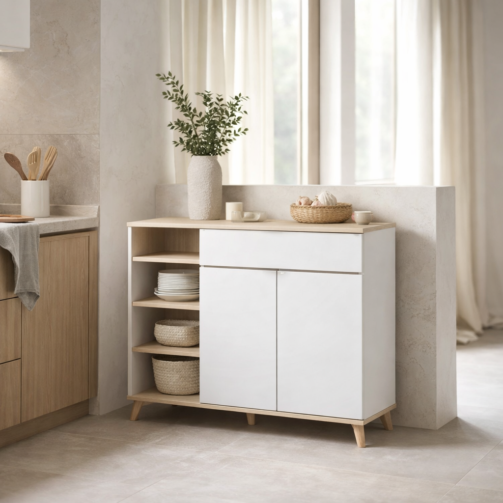 Nuestra alacena Aneko tiene un diseño muy elegante y enfocado en maximizar el espacio. Puede ubicarse en la cocina, o en el área del comedor, pero puede ser usado en diferentes habitaciones, ya que se considera un mueble multiusos. Su estructura es muy robusta y tiene terminado en tono blanco, al igual que en las puertas. En los estantes y el respaldo cuenta con tono natural. Tal combinación resulta muy fácil de adecuar a cualquier decoración. Cuenta con una zona de estantería abierta, la cual tiene 4 estantes amplios y muy resistentes. Del lado derecho se ubica un cajón de gran extensión, y debajo de él, un módulo con dos puertas y un estante inferior. Las patas son de estilo nórdico, por lo que aportan más estilo a al mueble.