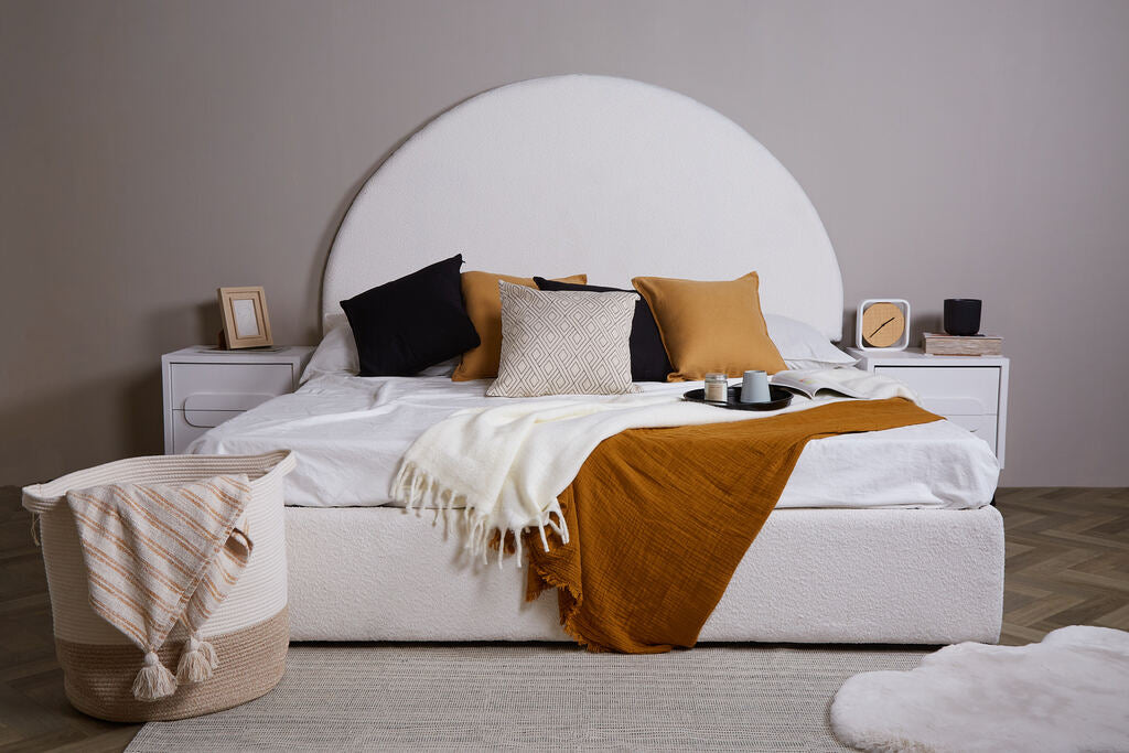MATERIAL: Tela Bouclé 100% Poliester, MDF, Melamina y Metal