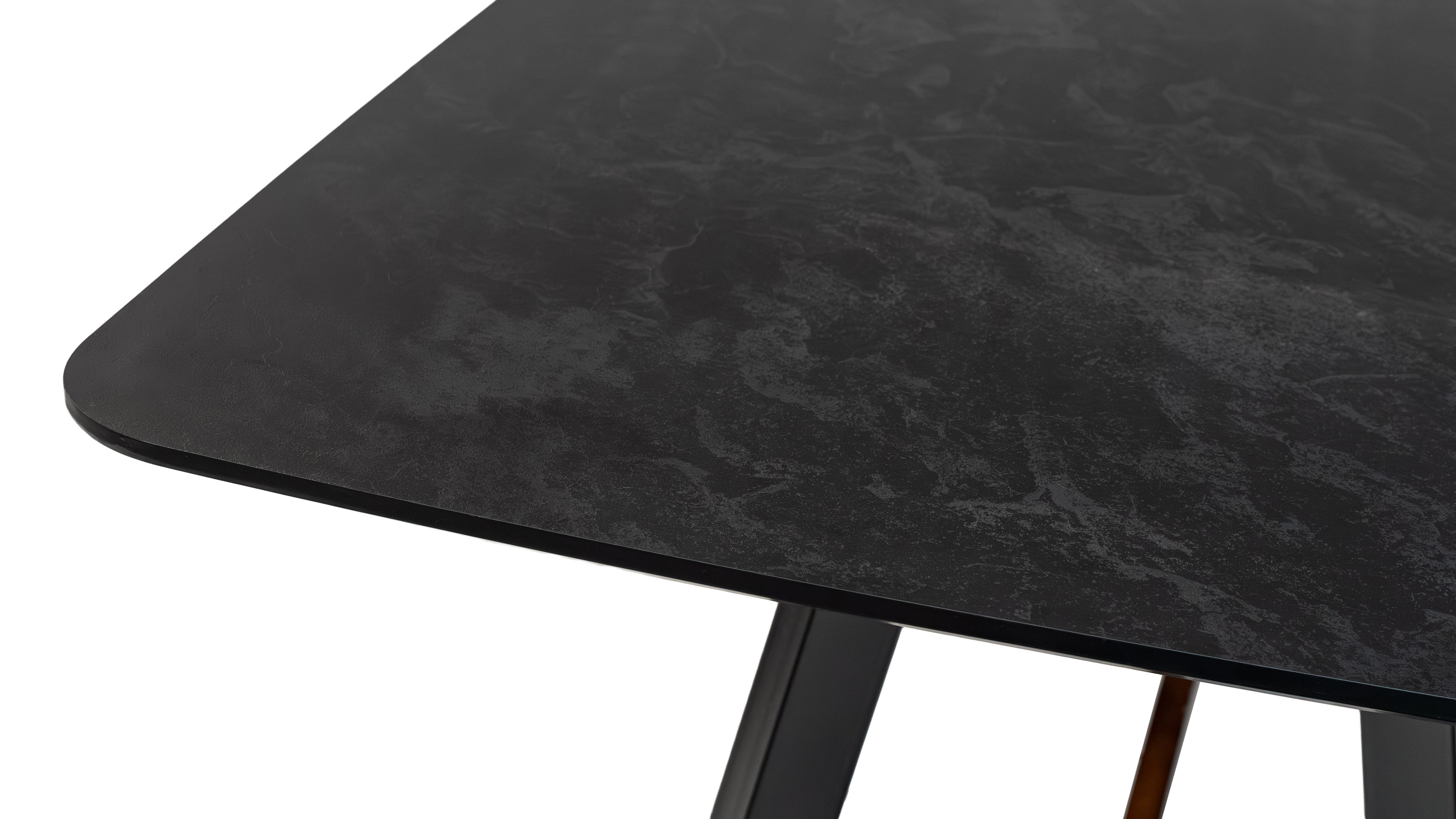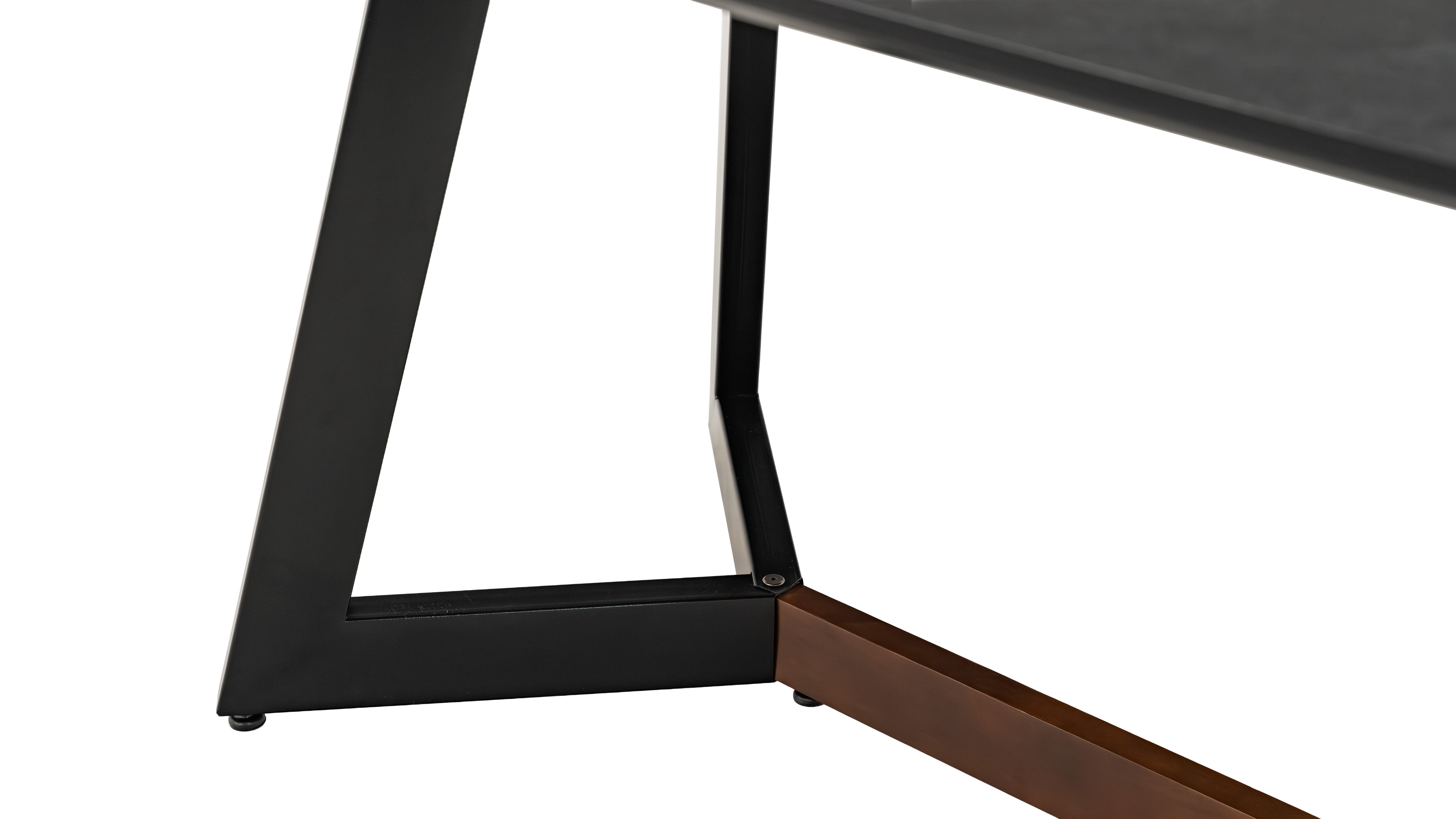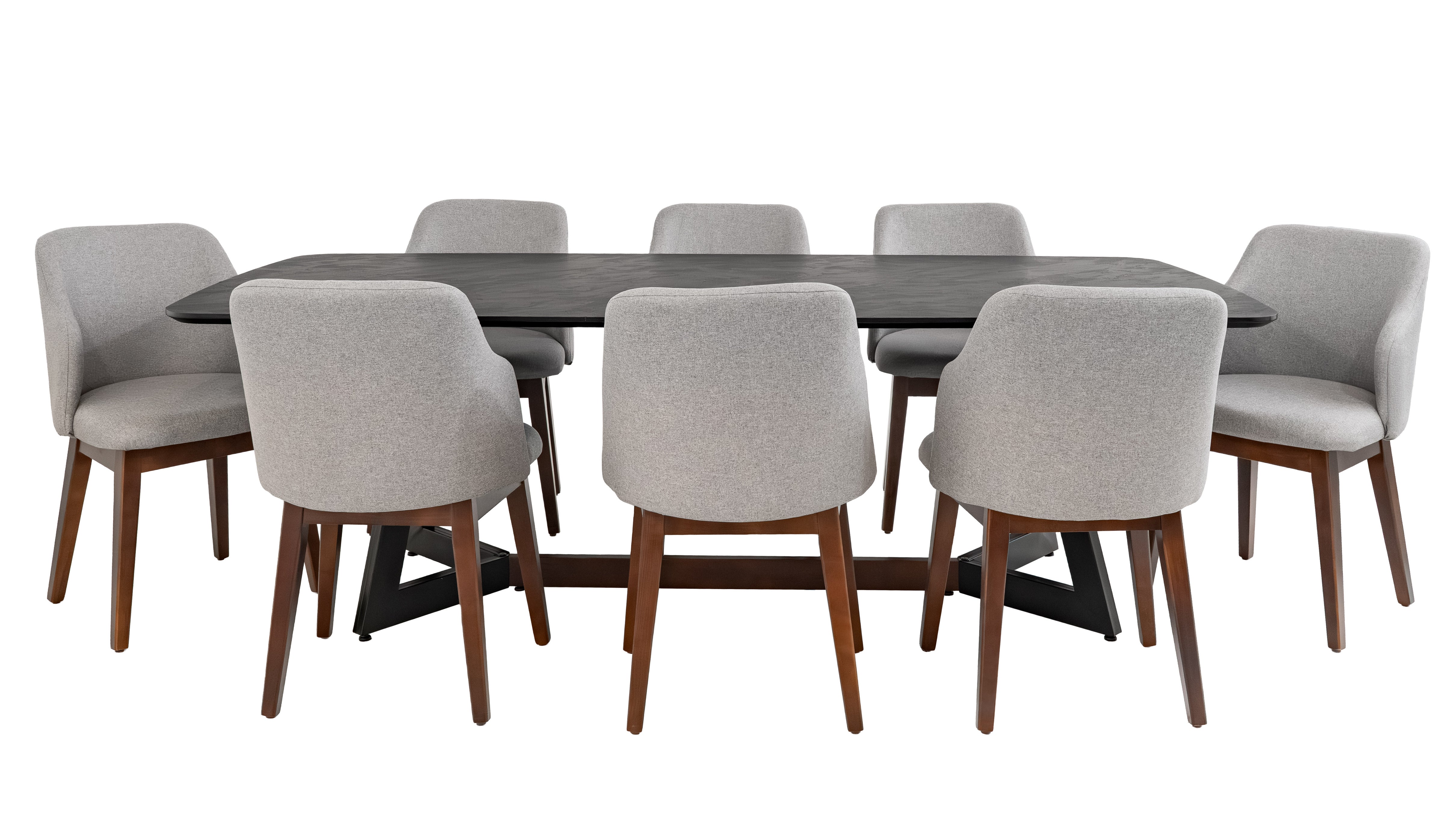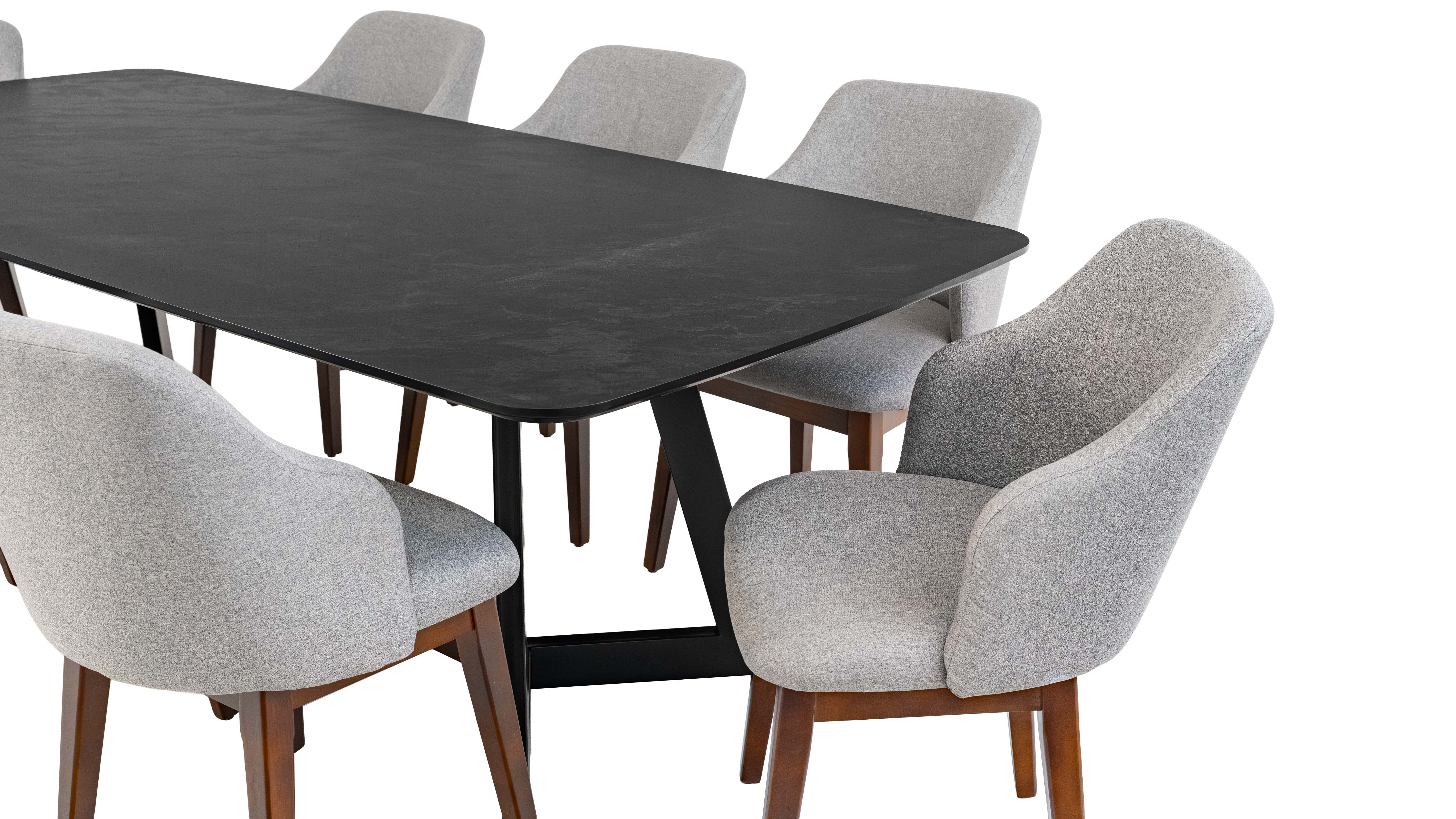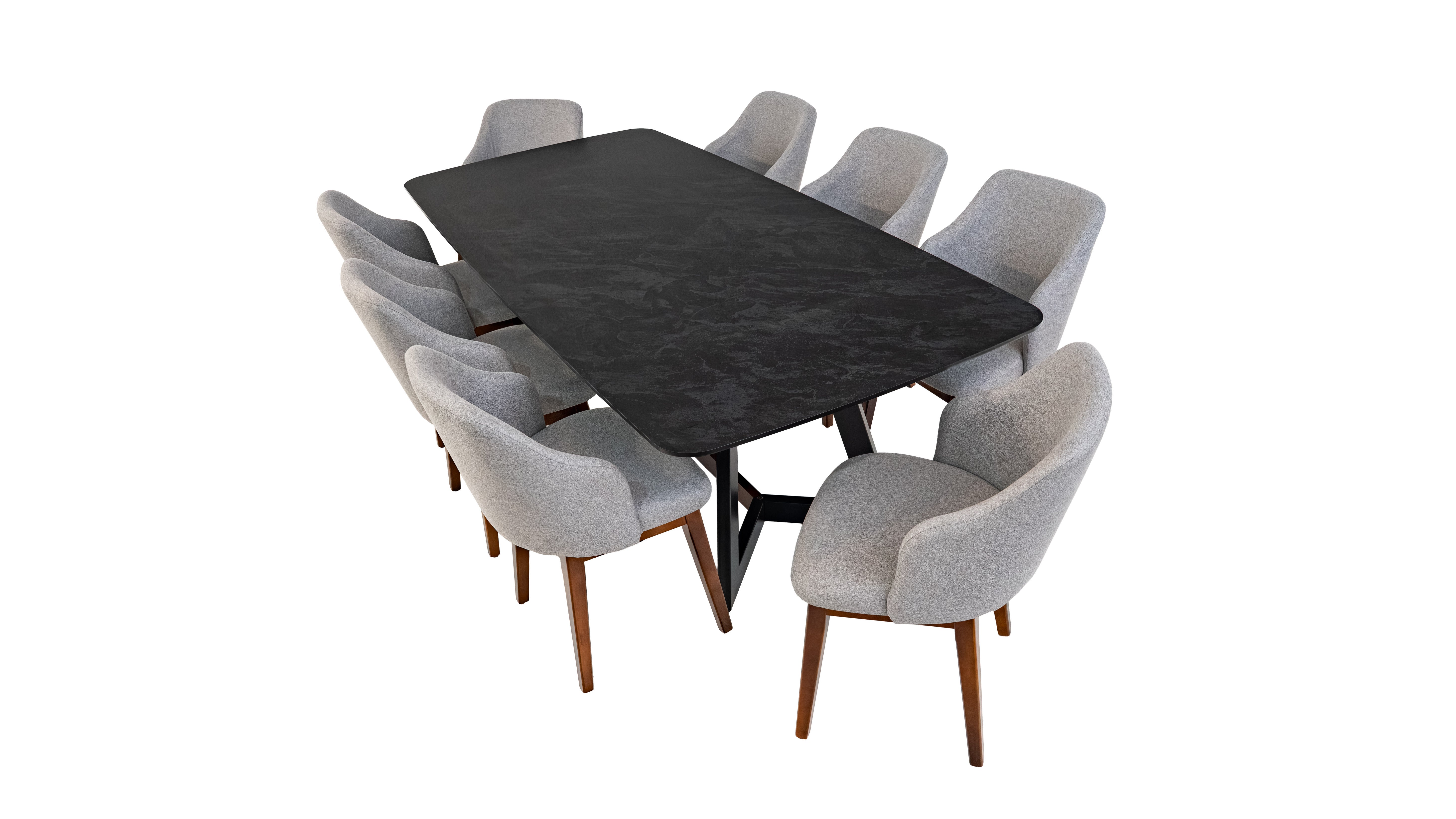 Mesa de Comedor para 8 personas de color negro con 8 sillas color gris con patas color encino