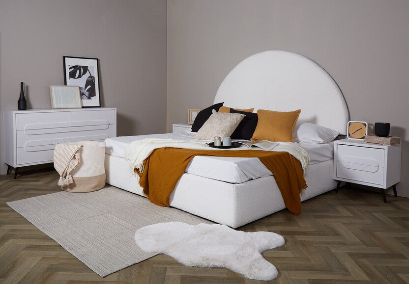 MATERIAL: Tela Bouclé 100% Poliester, MDF, Melamina y Metal