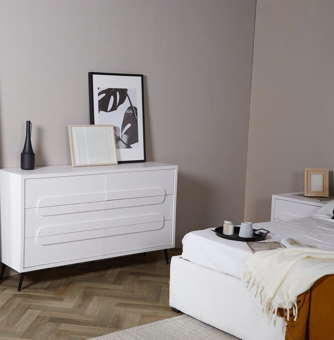 Descubre la fusión perfecta entre elegancia y diseño con este set de recámara completa, que incluye: una cabecera, dos burós, cuyo diseño versátil y almacenamiento eficiente mantiene la armonía y el orden; y una amplia cómoda cajonera, para mantener todo organizado. Su diseño elegante y funcional aporta estilo y sofisticación al ambiente. Todos los productos fueron fabricados con materiales duraderos y un diseño atemporal. La cabecera se entrega completamente armada, las mesas de noche y la cómoda requieren el ensamble de las patas, el cual es sencillo e intuitivo. Un conjunto perfecto para transformar tu dormitorio en un refugio con estilo y confort. No incluye base para cama ni colchón.