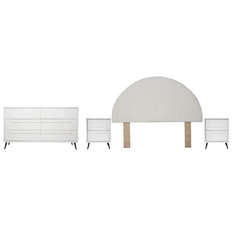 Juego de 4 piezas: incluye cabecera, dos burós y cómoda. No incluye base ni colchón. Se adapta a cualquier tamaño de base y colchón.