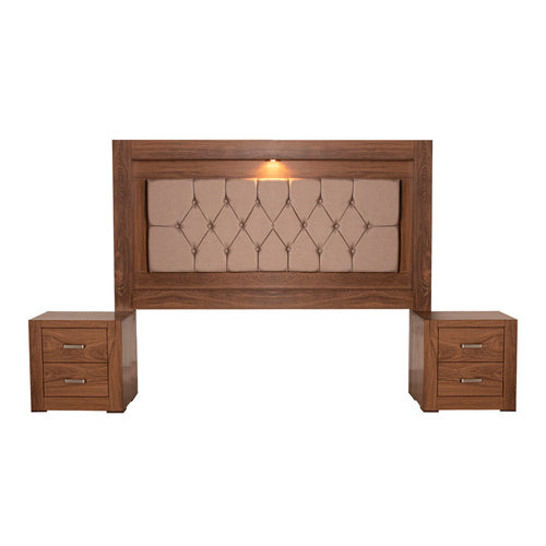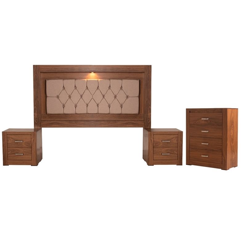 Descubre la fusión perfecta entre elegancia y diseño con este set de recámara completa, que incluye: una cabecera con luz integrada, ideal para un adaptarse a cualquier tamaño de base y colchón; dos burós, cuyo diseño versátil y almacenamiento eficiente mantiene la armonía y el orden; y una amplia cómoda cajonera, para mantener todo organizado. Su diseño elegante y funcional aporta estilo y sofisticación al ambiente. Todos los productos fueron fabricados con materiales duraderos y un diseño atemporal. Se entregan completamente armados para su uso inmediato. Un conjunto perfecto para transformar tu dormitorio en un refugio con estilo y confort. No incluye base para cama ni colchón.