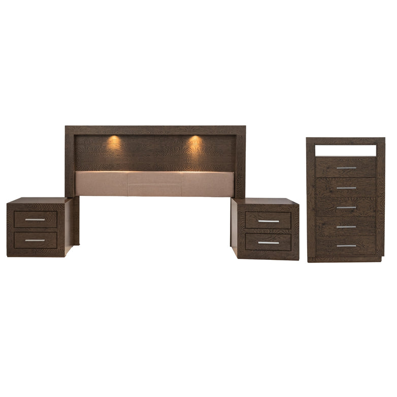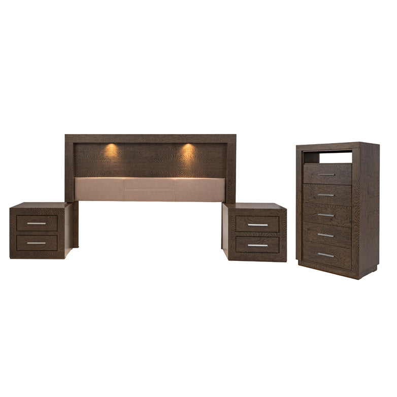 Descubre la fusión perfecta entre elegancia y diseño con este set de recámara completa, que incluye: una cabecera con luz integrada, ideal para un colchón tamaño king; dos burós, cuyo diseño versátil y almacenamiento eficiente mantiene la armonía y el orden; y una amplia cómoda cajonera, para mantener todo organizado. Su diseño elegante y funcional aporta estilo y sofisticación al ambiente. Todos los productos fueron fabricados con materiales duraderos y un diseño atemporal. Se entregan completamente armados para su uso inmediato. Un conjunto perfecto para transformar tu dormitorio en un refugio con estilo y confort. No incluye base para cama ni colchón.