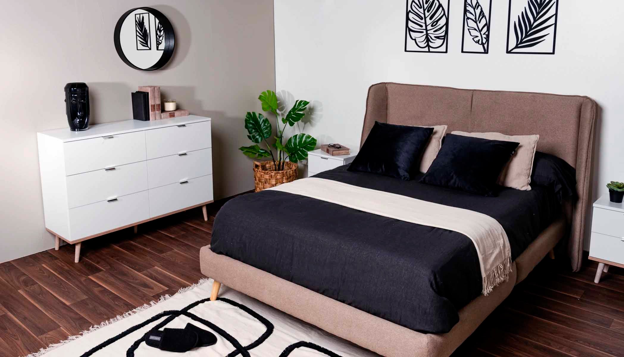Elegante y resistente cama con cabecero y estructura para albergar un colchón king que te ayudará a crear una atmósfera sumamente apacible y confortable. El cabecero, mullido y blando, te resultará muy cómodo para apoyar la espalda mientras lees o ves la televisión.