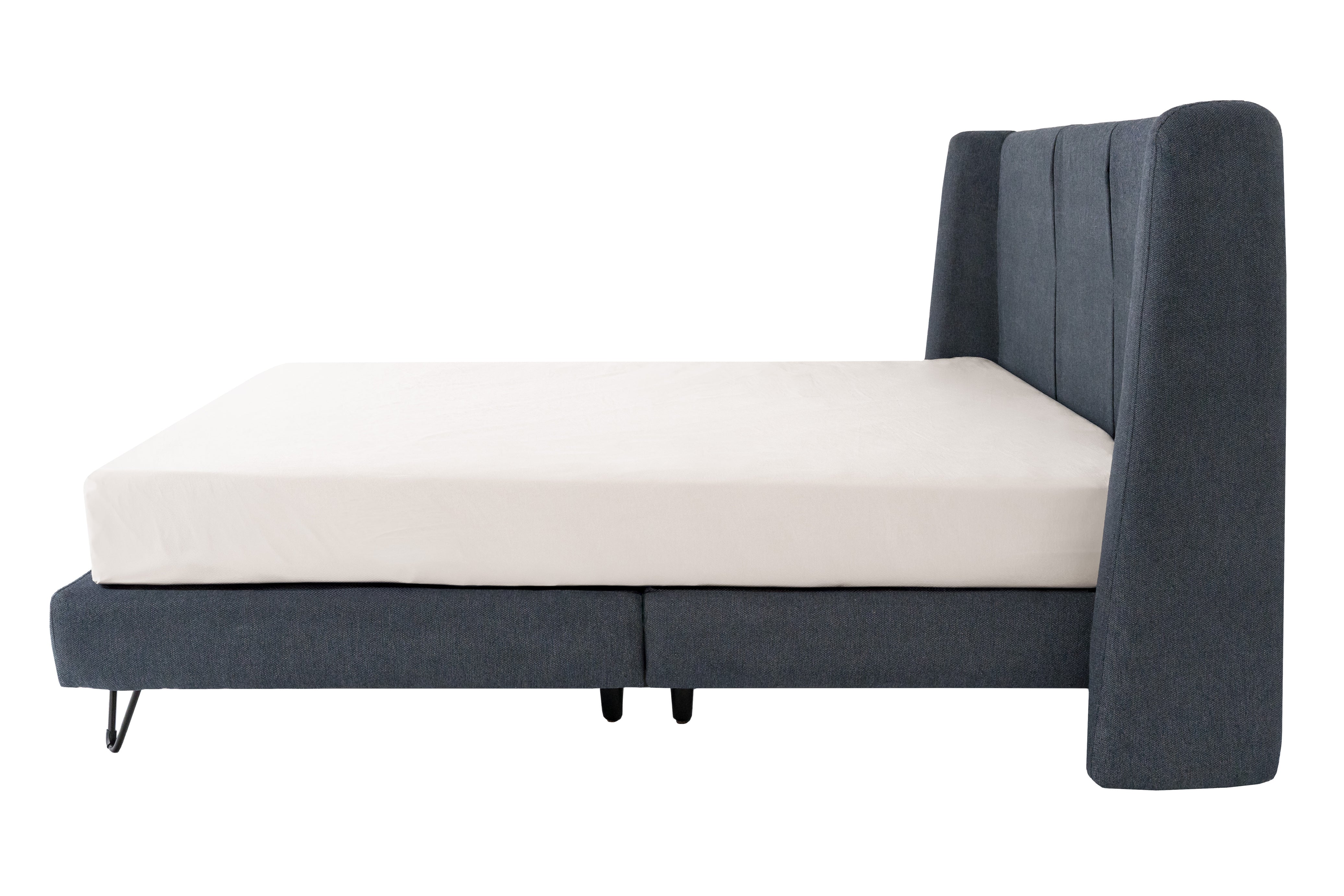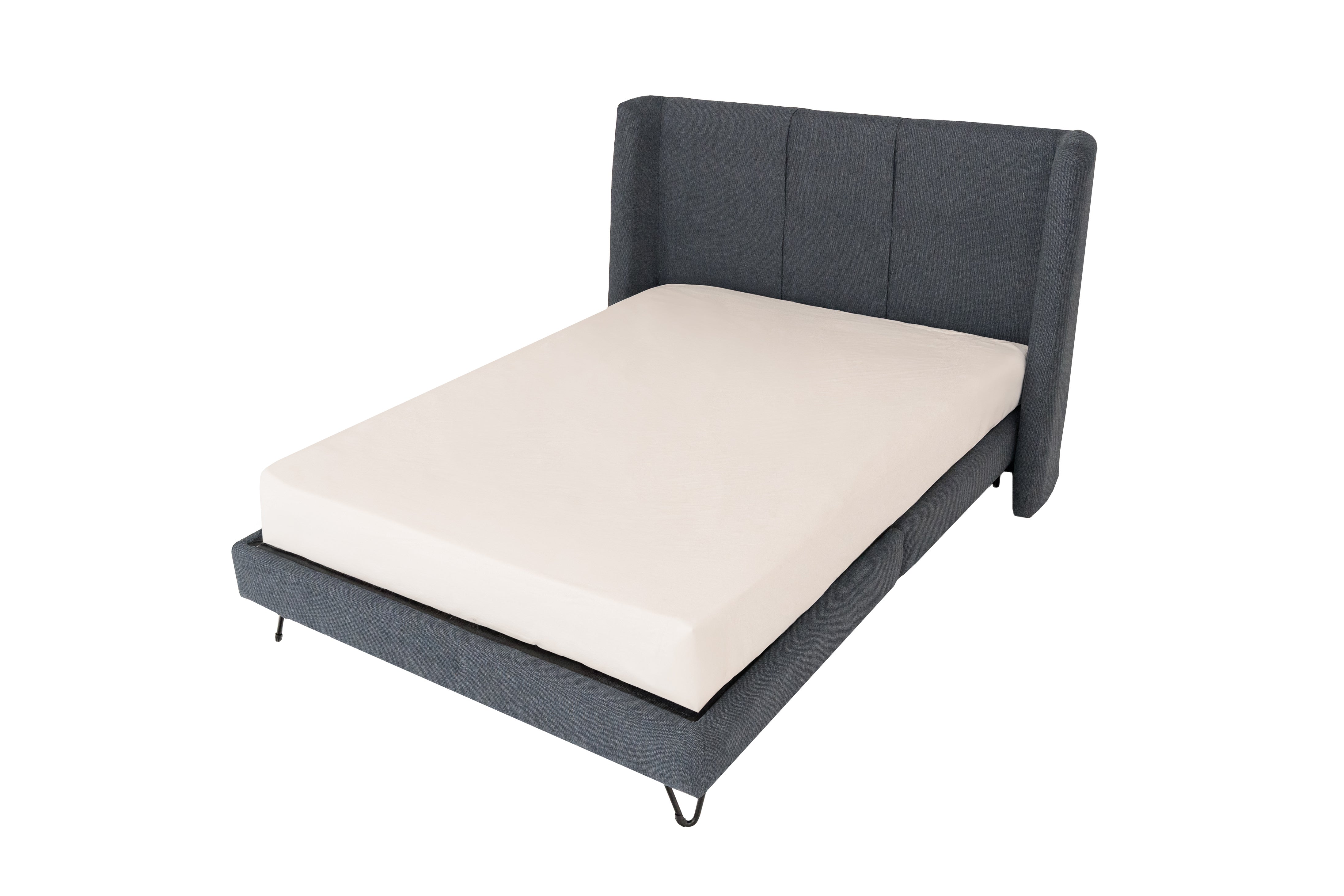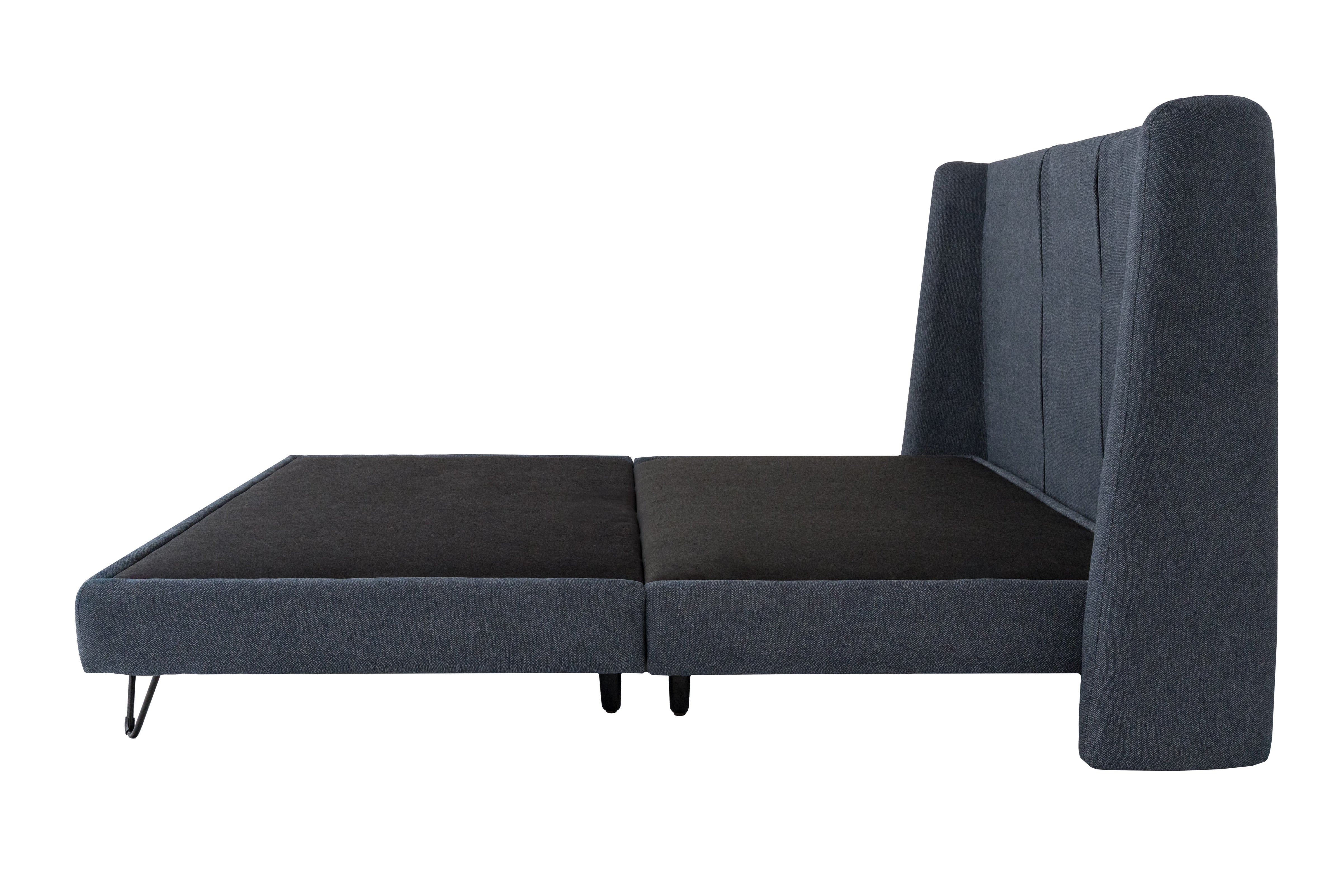 Estilo contemporáneo con un toque de frescura. Esta cama Matrimonial, tapizada en tela bitonal color azul, ofrece una combinación de diseño moderno y confort absoluto. La textura de la tela añade dimensión y elegancia, mientras que el color azul transmite serenidad y equilibrio, ideal para transformar tu dormitorio en un refugio de descanso. Su presencia imponente y su acabado visual hacen de esta cama una pieza central con gran personalidad.