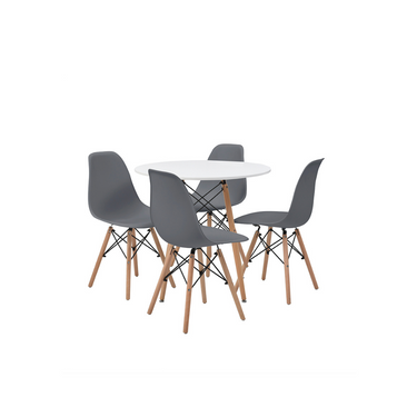 Mesa redonda blanca en MDF con melamina. Base de madera y soporte metálico en color negro. 4 sillas grises con respaldo y asiento en polipropileno. Base de madera de haya con estructura metálica para soporte