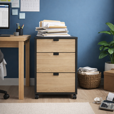 El archivero móvil ofrece una práctica solución de almacenamiento, con tres espaciosos cajones, equipado con ruedas y frenos, así como jaladeras metálicas. Este mueble proporciona movilidad y estabilidad, lo que facilita su colocación y seguridad en su espacio de trabajo.