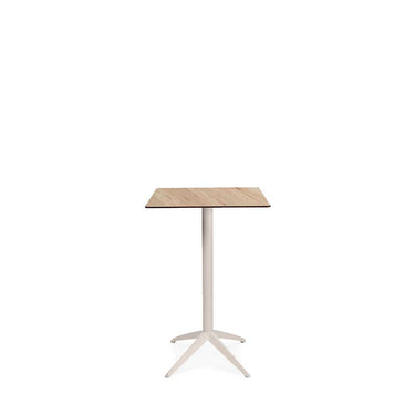 Mesa de exterior cuadrada de 70 x 70 cm, con pata de polipropileno, tubo de aluminio blanco y y cubierta compact diseño roble claro. Para uso exterior e interior. Producto de uso público y doméstico.