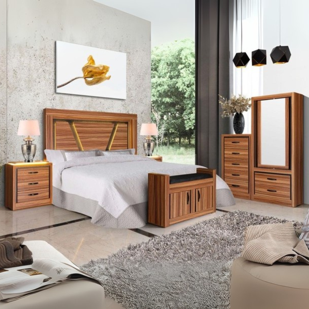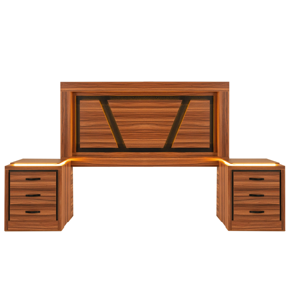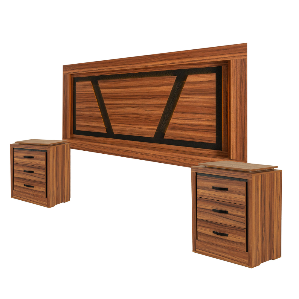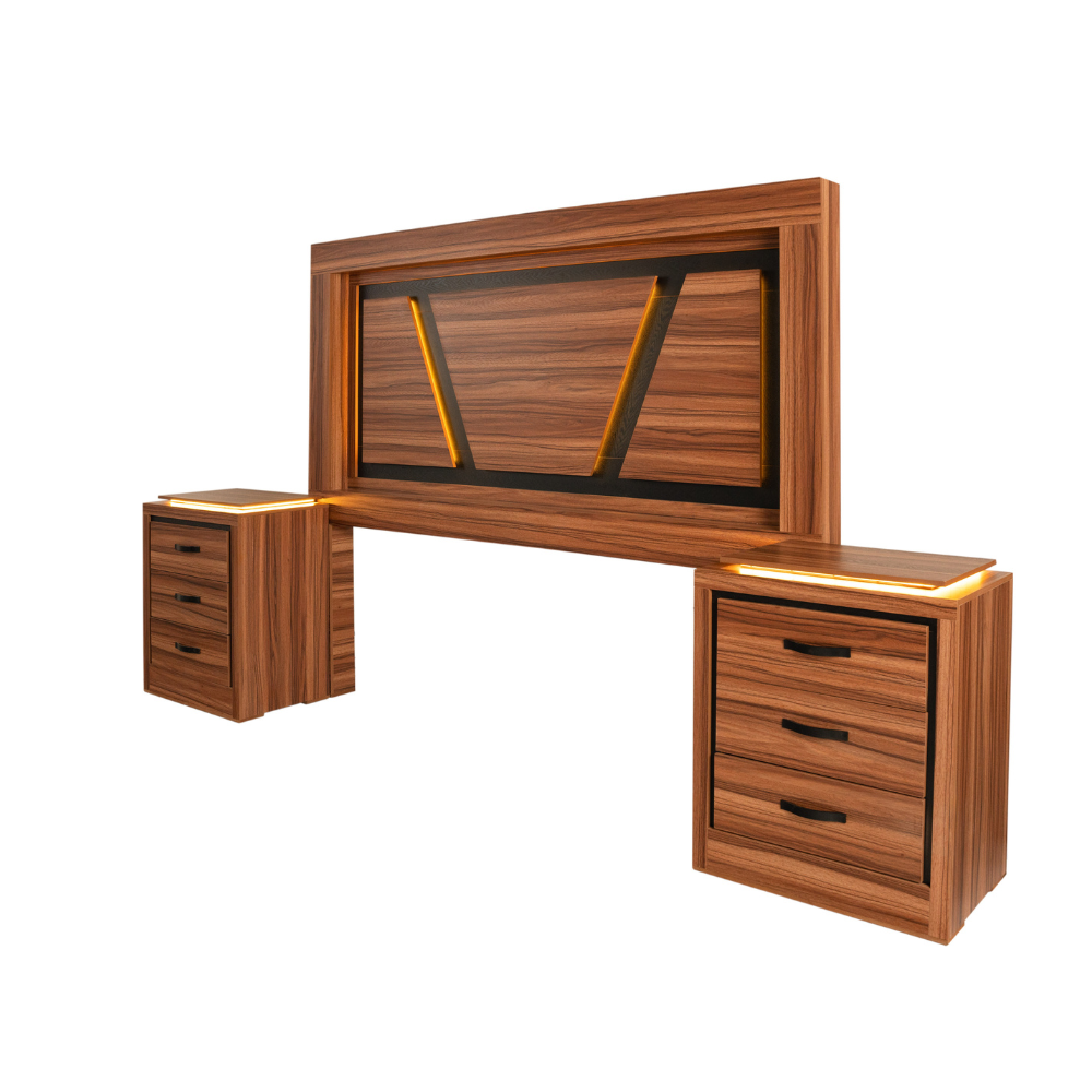 Transforma tu dormitorio con este set que incluye una cabecera con luz integrada y dos burós, fusionando estética, funcionalidad y confort en un solo conjunto. La cabecera, diseñada para camas tamaño King Size, redefine el descanso con su iluminación ambiental, estilo y acabados de alta calidad, aportando calidez y sofisticación a tu espacio. Las mesas de noche ofrecen almacenamiento eficiente, luz integrada y un diseño versátil que complementa perfectamente cualquier habitación. Fabricados con materiales duraderos y un estilo atemporal, se entregan completamente armados para un uso inmediato. Eleva tu hogar con un conjunto pensado para brindar distinción, orden y bienestar.