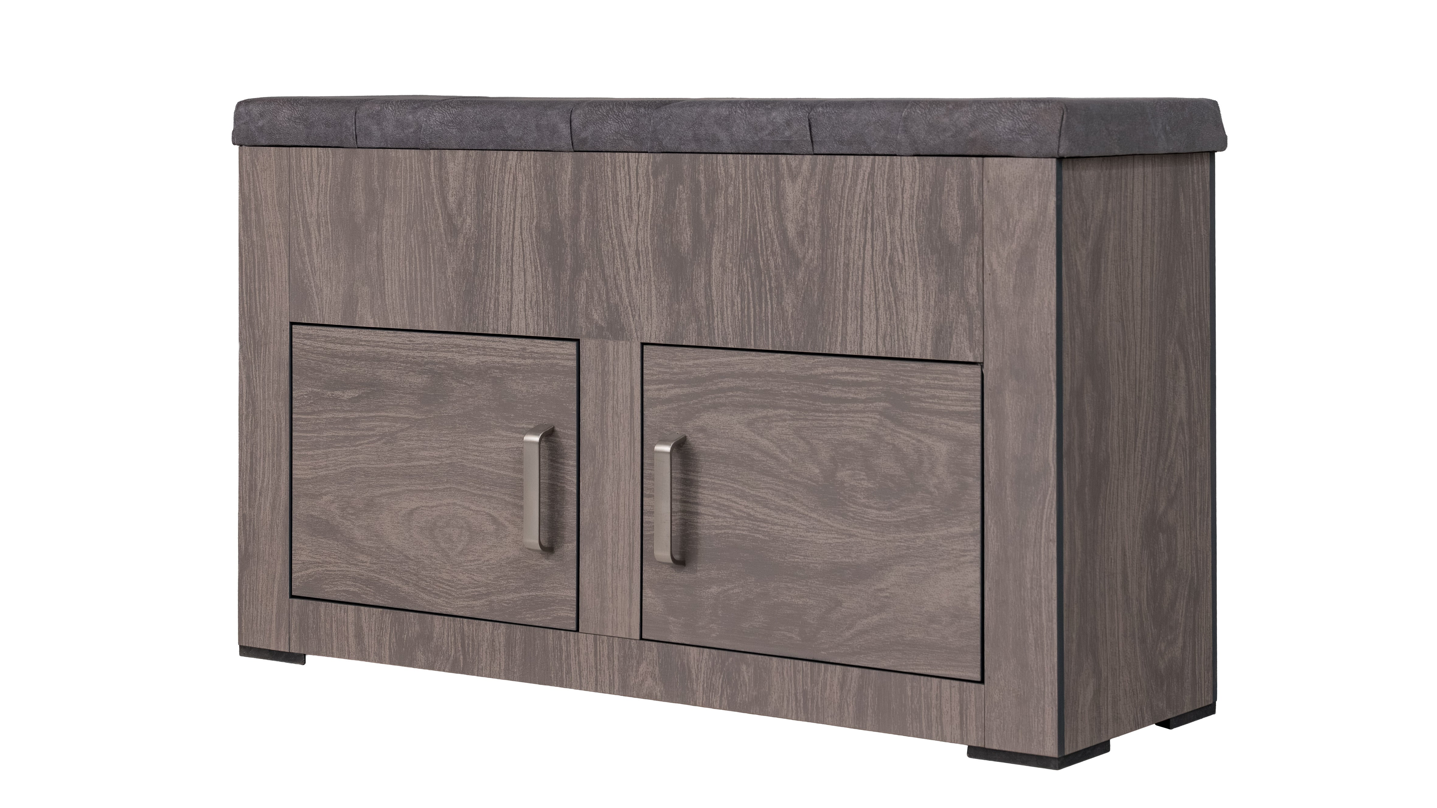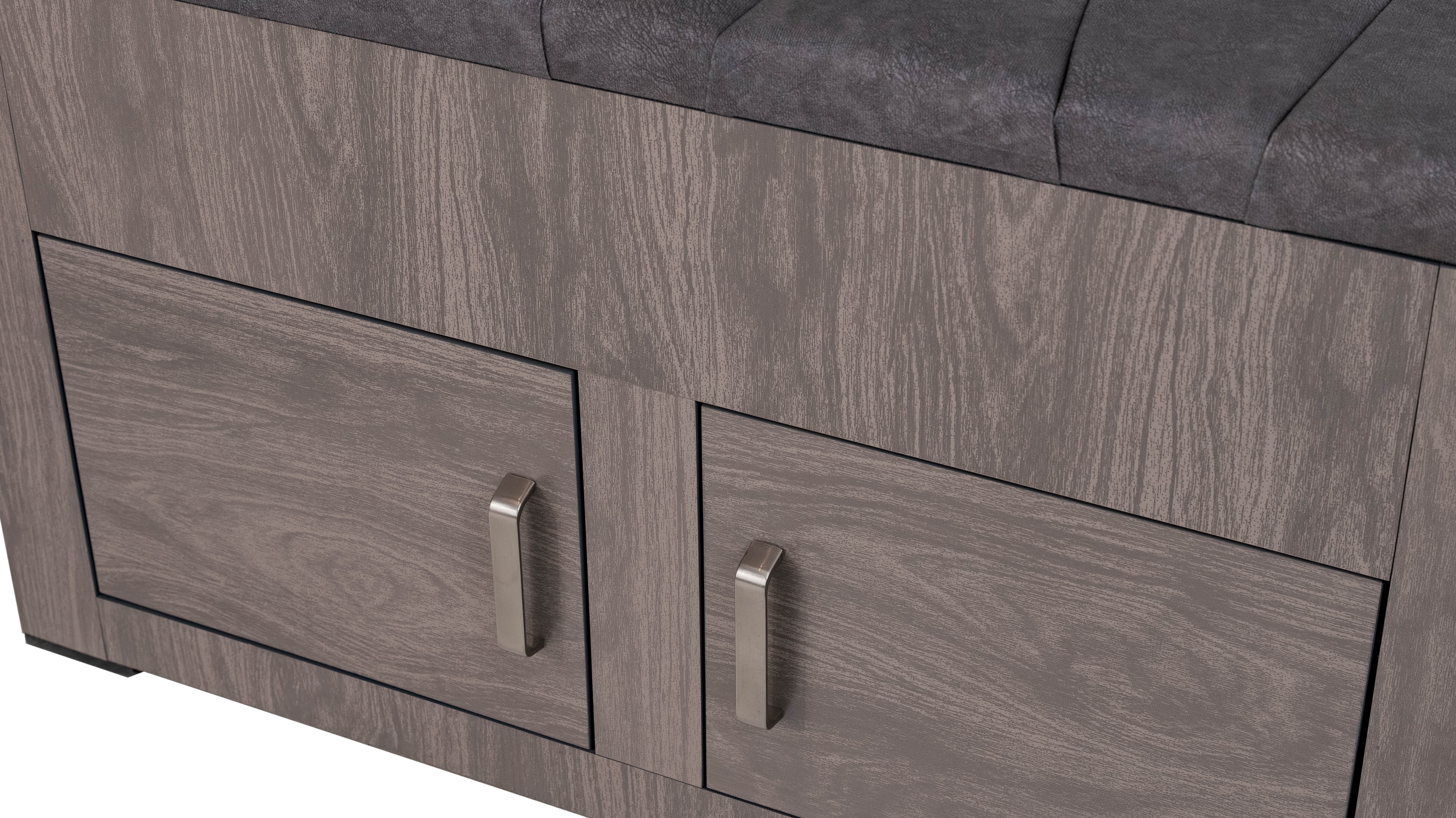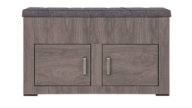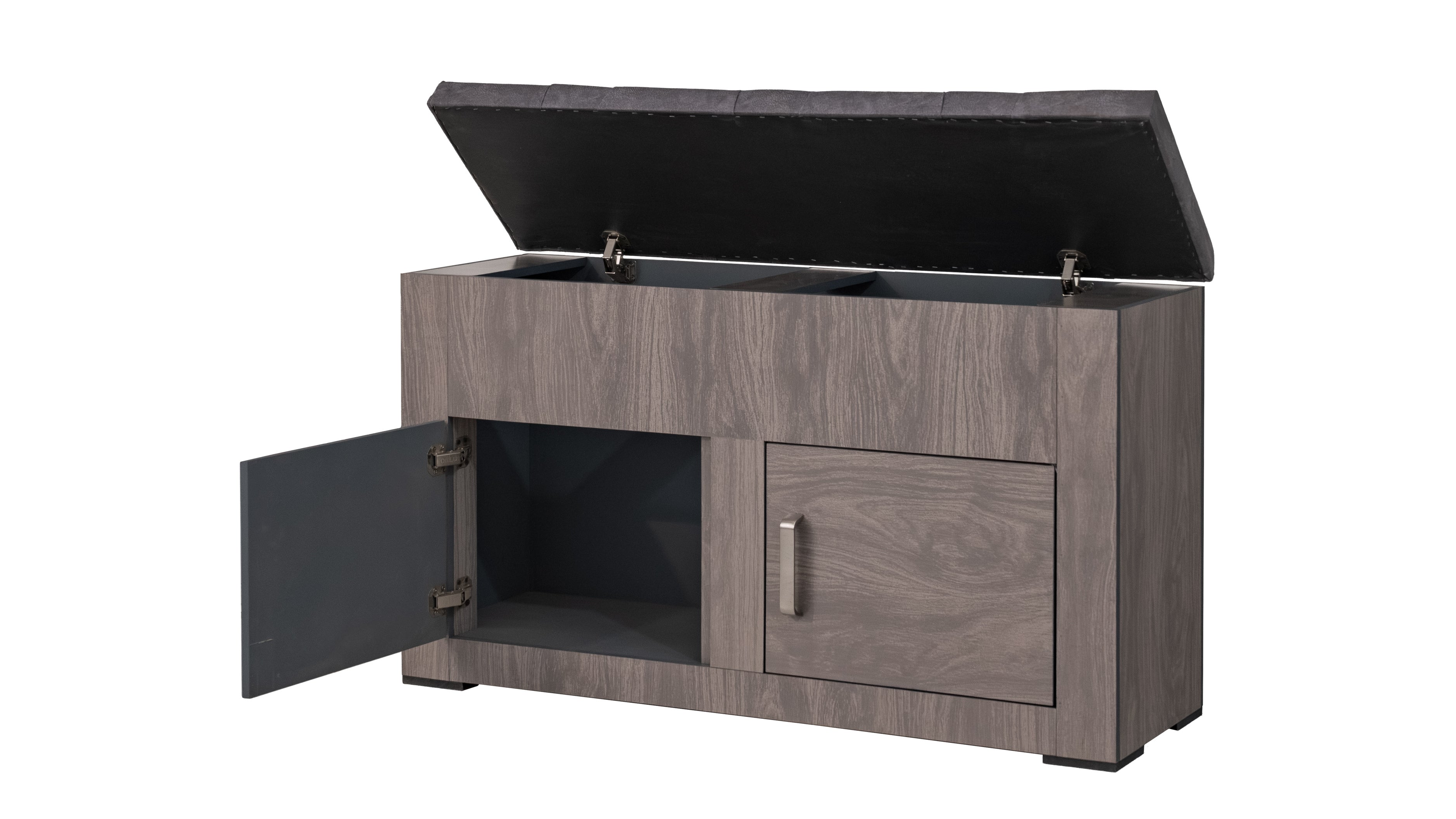 Agrega funcionalidad y estilo a tu recámara con este baúl tipo banca tapizada. Su diseño práctico integra dos compartimentos interiores ideales para almacenar ropa de cama, cojines o accesorios, ayudándote a mantener el orden en tu espacio. La banca superior acolchonada ofrece un asiento cómodo, perfecto para complementar el pie de cama, el vestidor o cualquier rincón del hogar. Fabricado con materiales de alta calidad y acabados elegantes tipo madera, este baúl combina almacenamiento inteligente con diseño decorativo, elevando la funcionalidad de cualquier habitación.