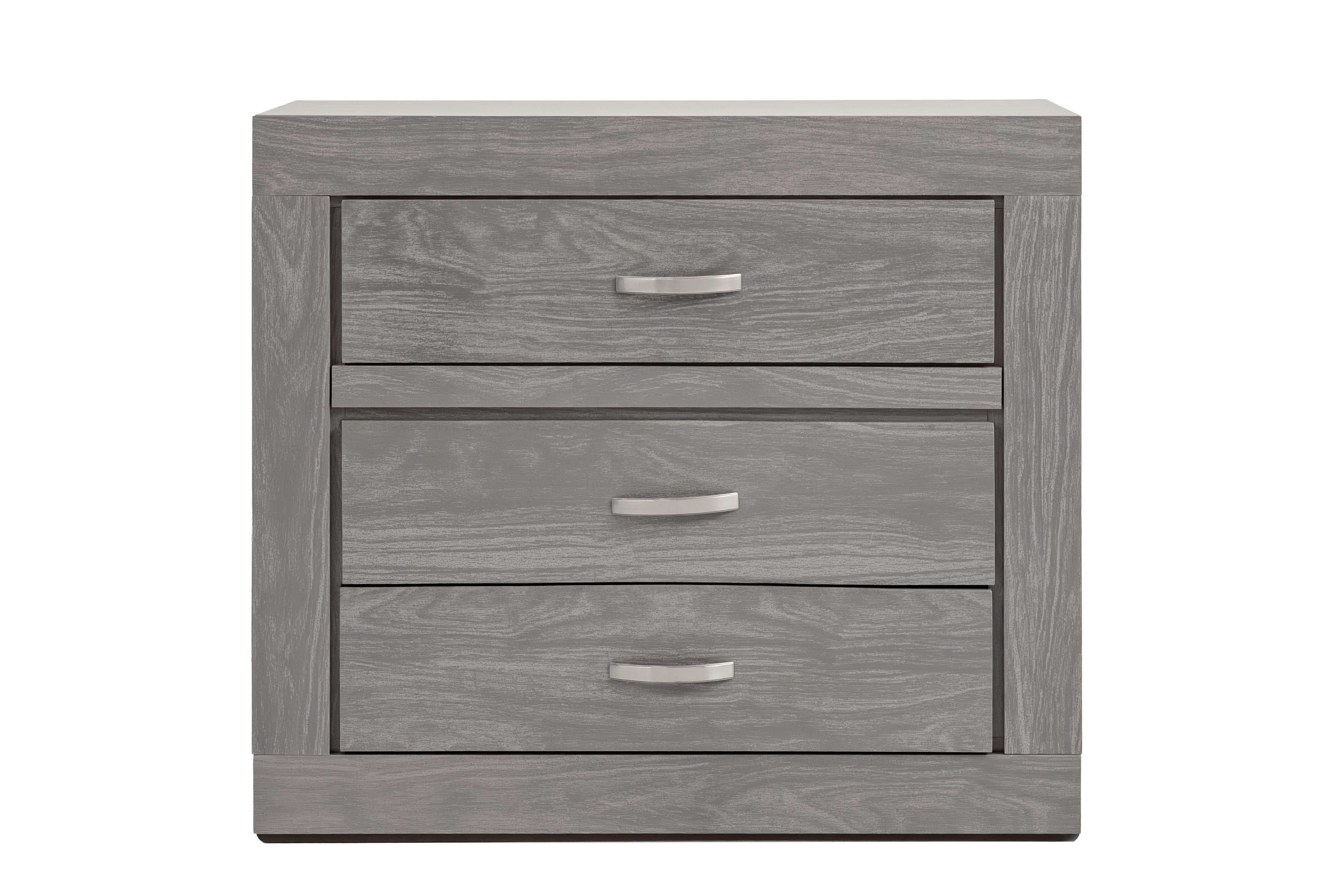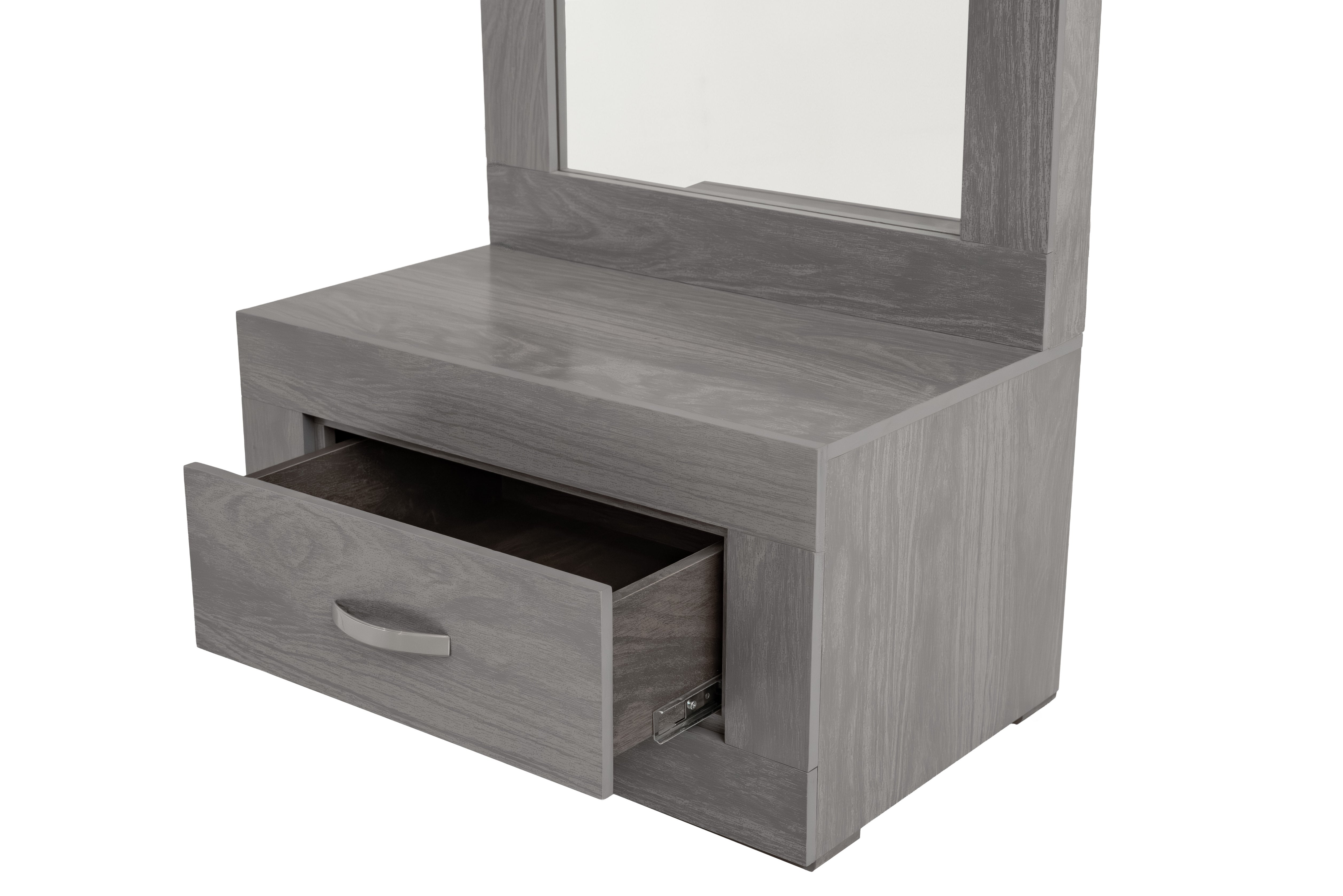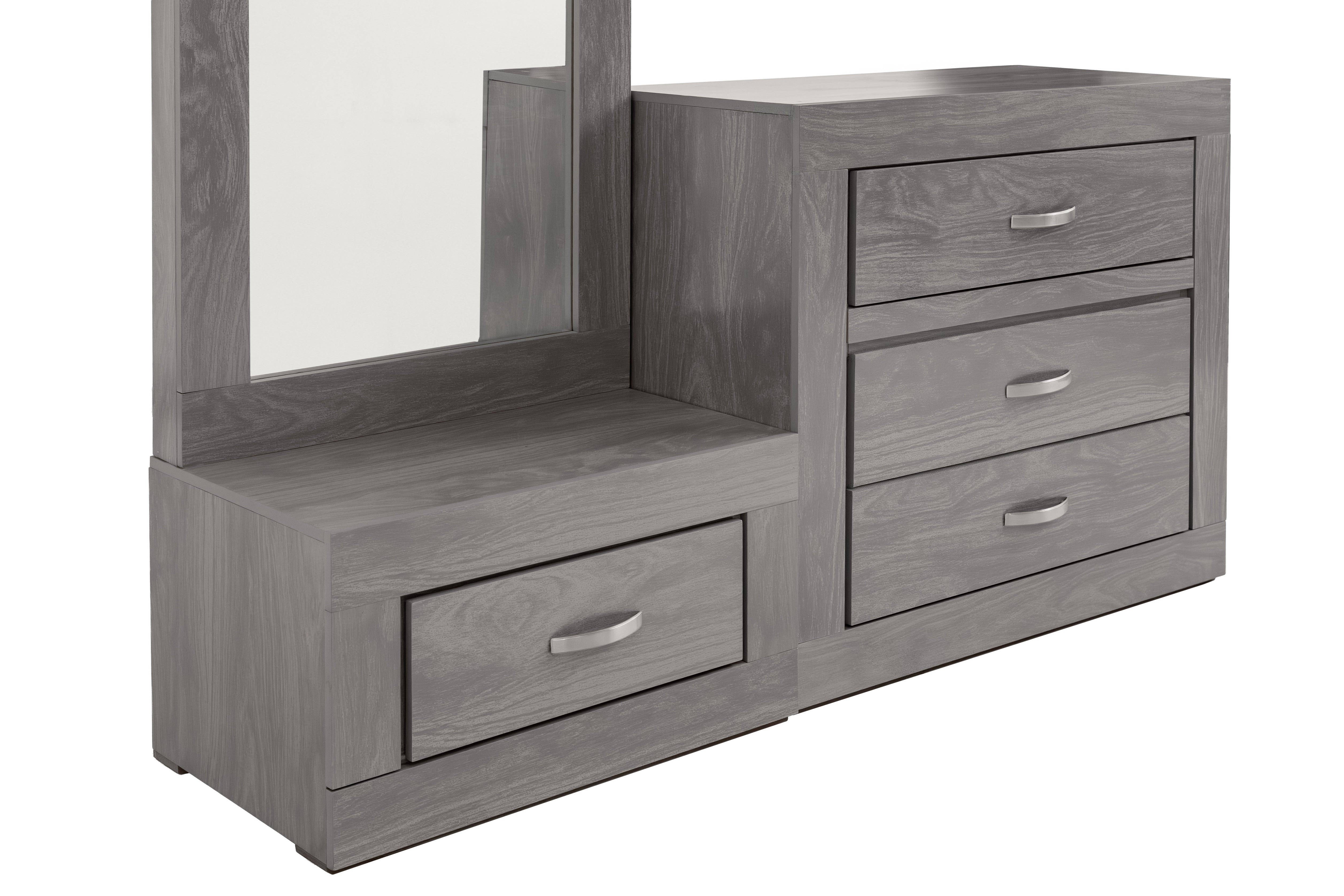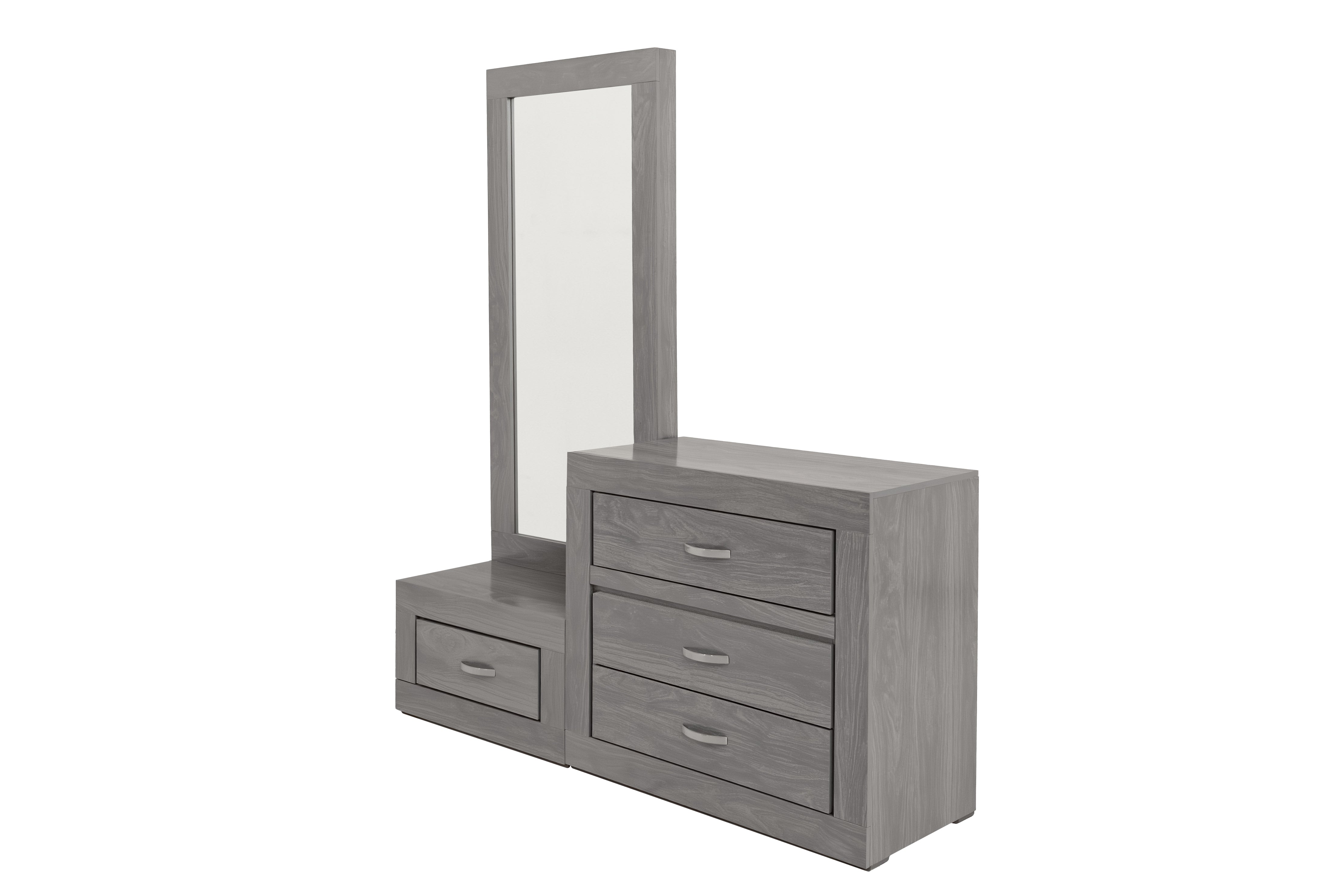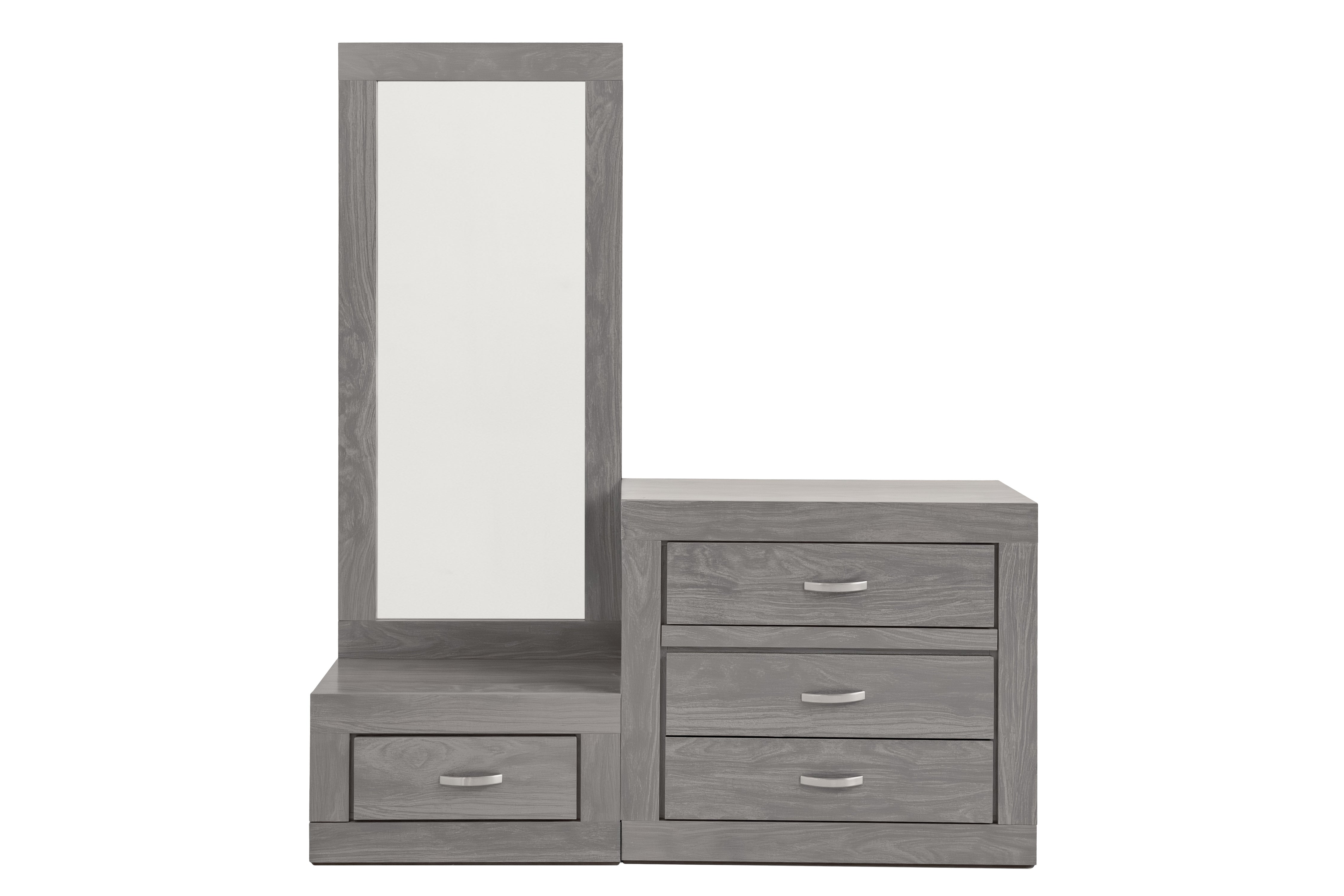 Cómoda y espejo de cuerpo completo de color gris. Se entrega armado.