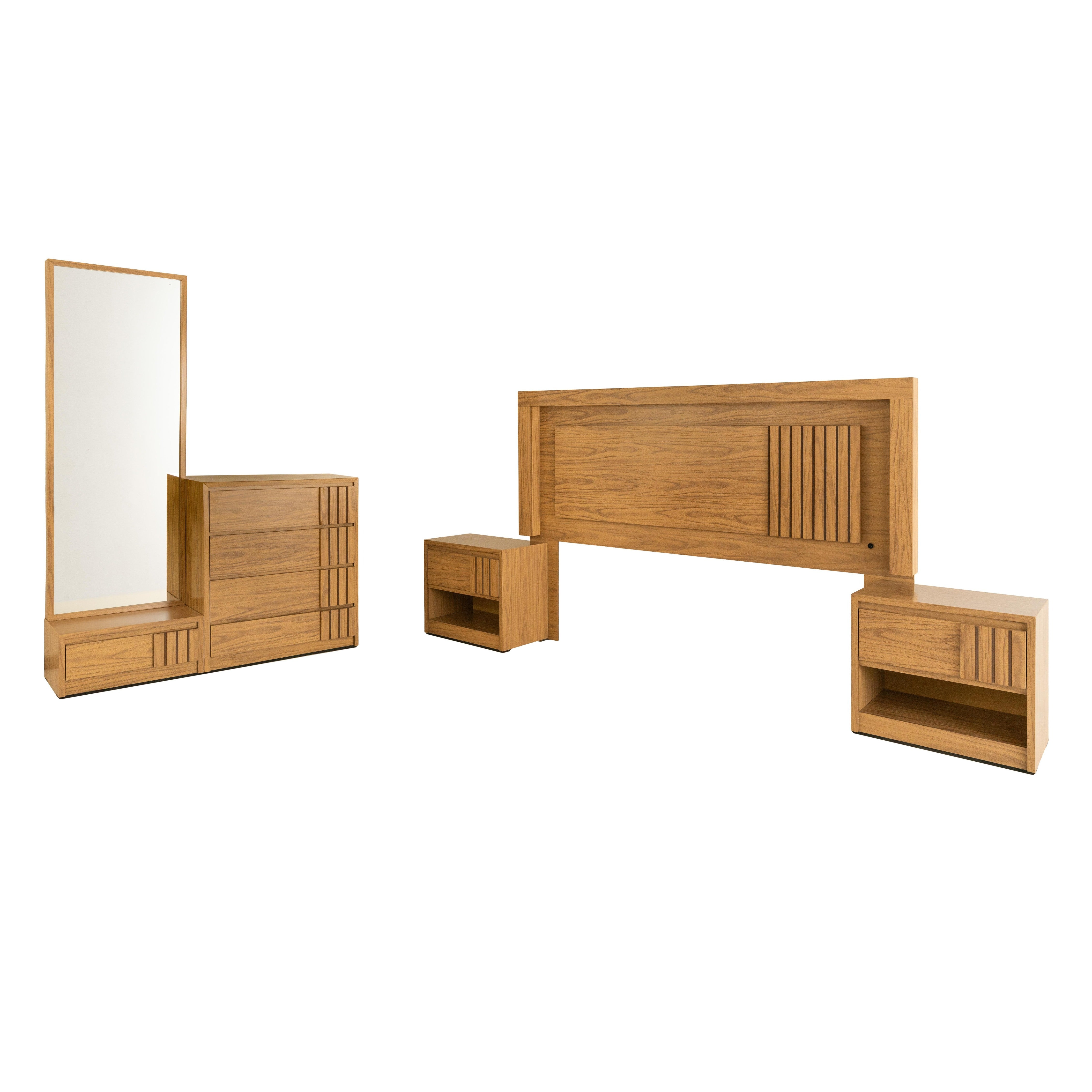 Juego de 5 piezas: incluye cabecera, dos burós, cajonera y espejo. No incluye base ni colchón. Se adapta a cualquier tamaño de base y colchón.