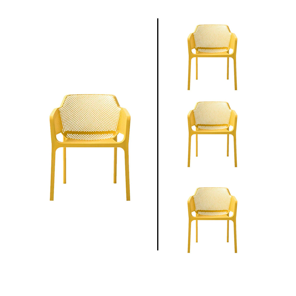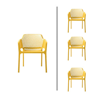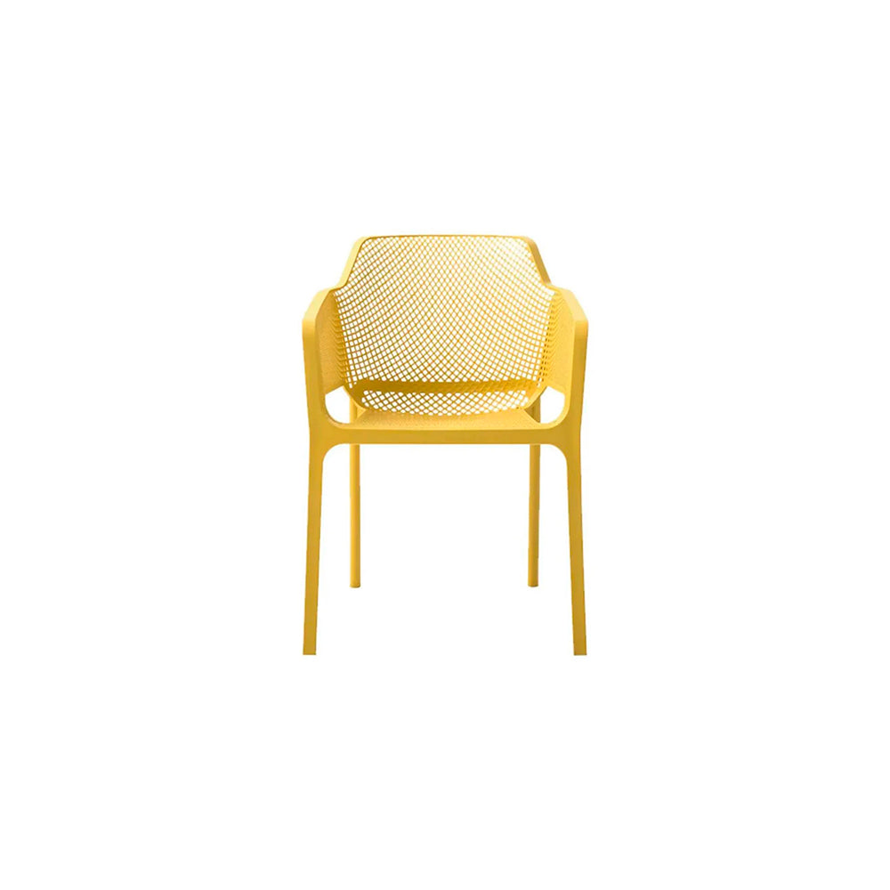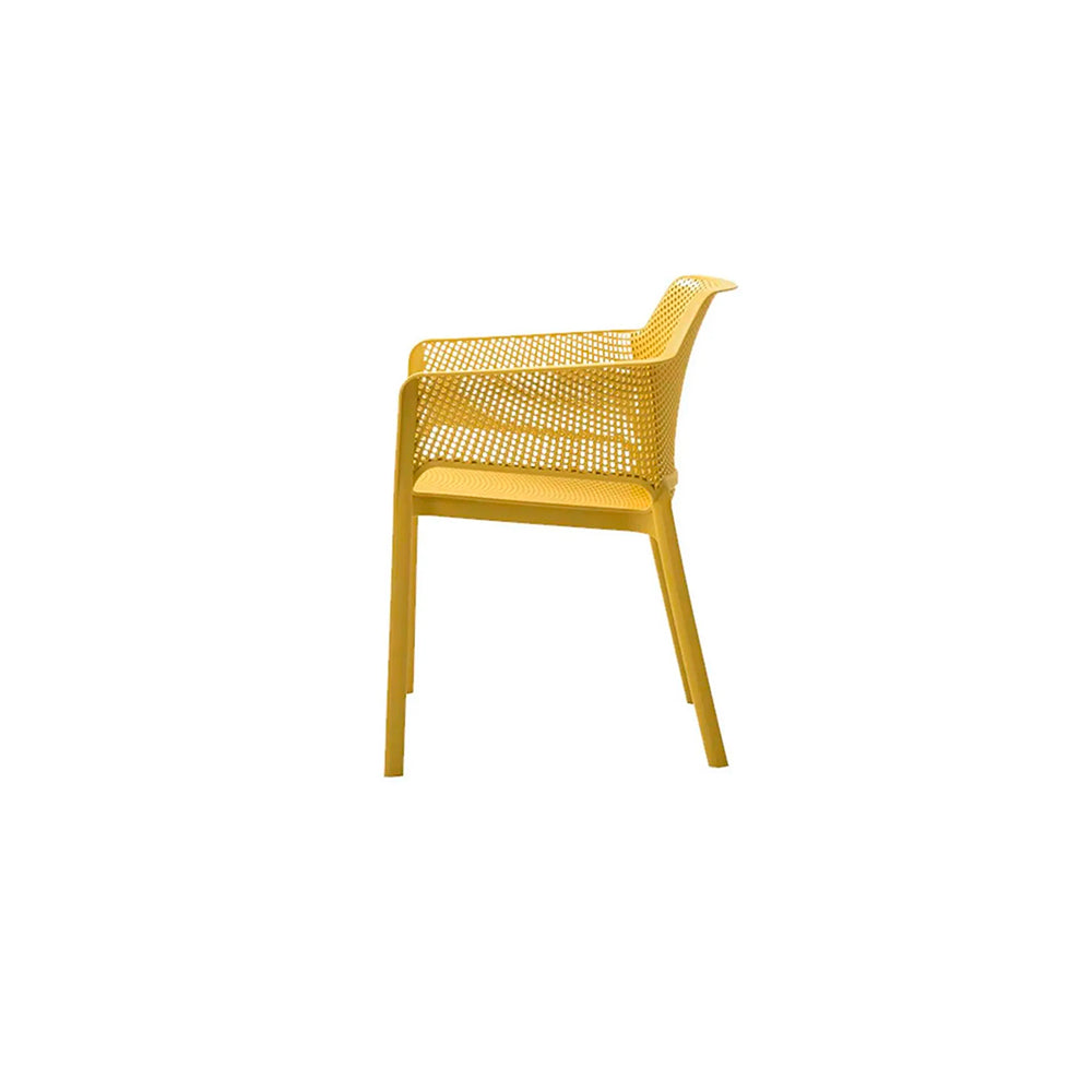 Silla apilable con brazos, en polipropileno fiberglass tratado anti UV y teñido en masa, tacos antideslizantes y efecto mate. Incluye un cojín en tejido acrílico impermeable.