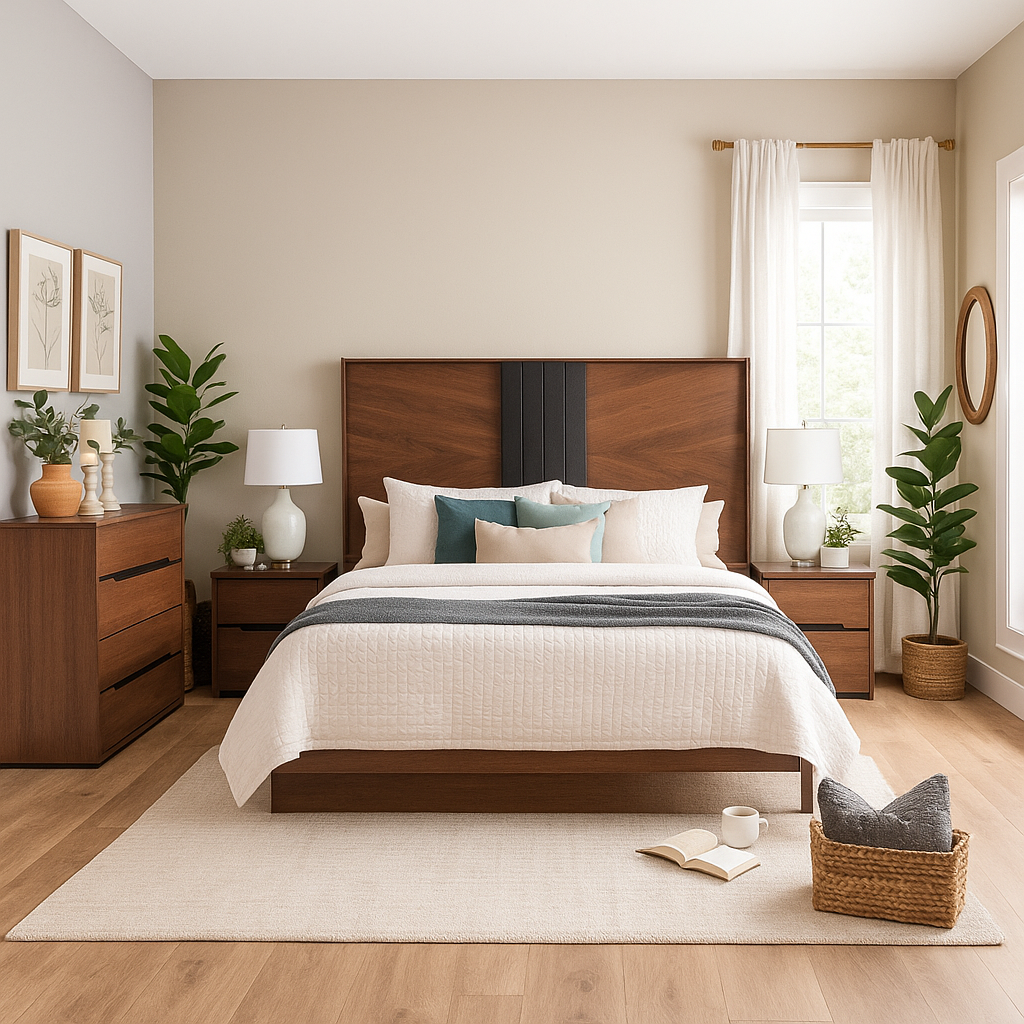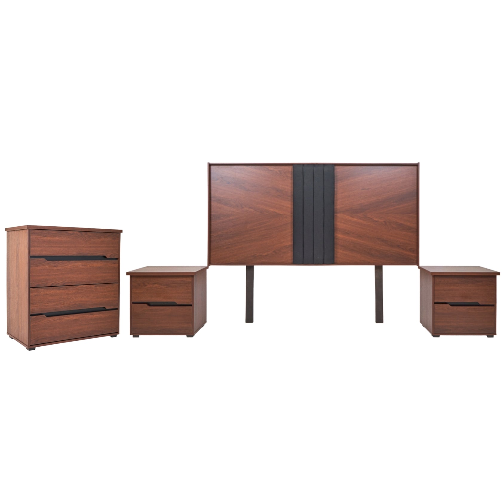 Juego de 4 piezas: incluye cabecera, dos burós y cómoda. No incluye base ni colchón. Se adapta a cualquier tamaño de base y colchón.