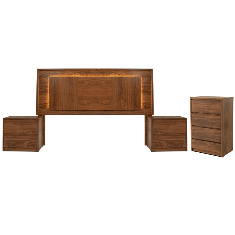 Juego de 4 piezas: incluye cabecera, dos burós y cómoda. No incluye base ni colchón. Se adapta a cualquier tamaño de base y colchón.
