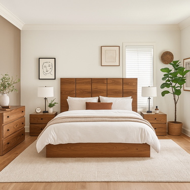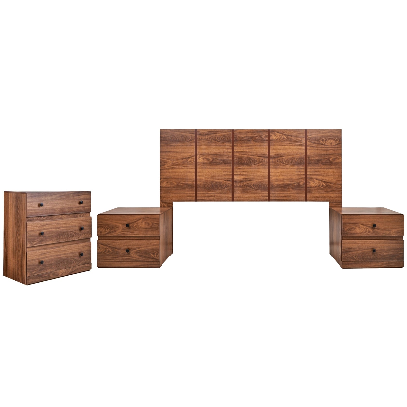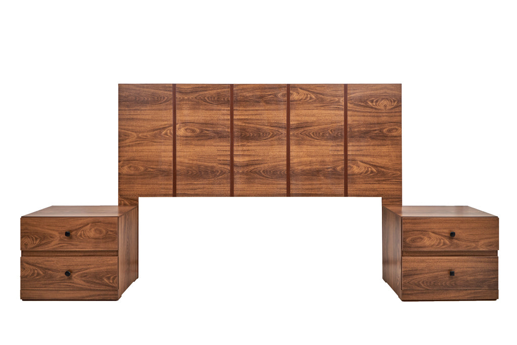 Juego de 4 piezas: incluye cabecera, dos burós y cómoda. No incluye base ni colchón. Se adapta a cualquier tamaño de base y colchón.
