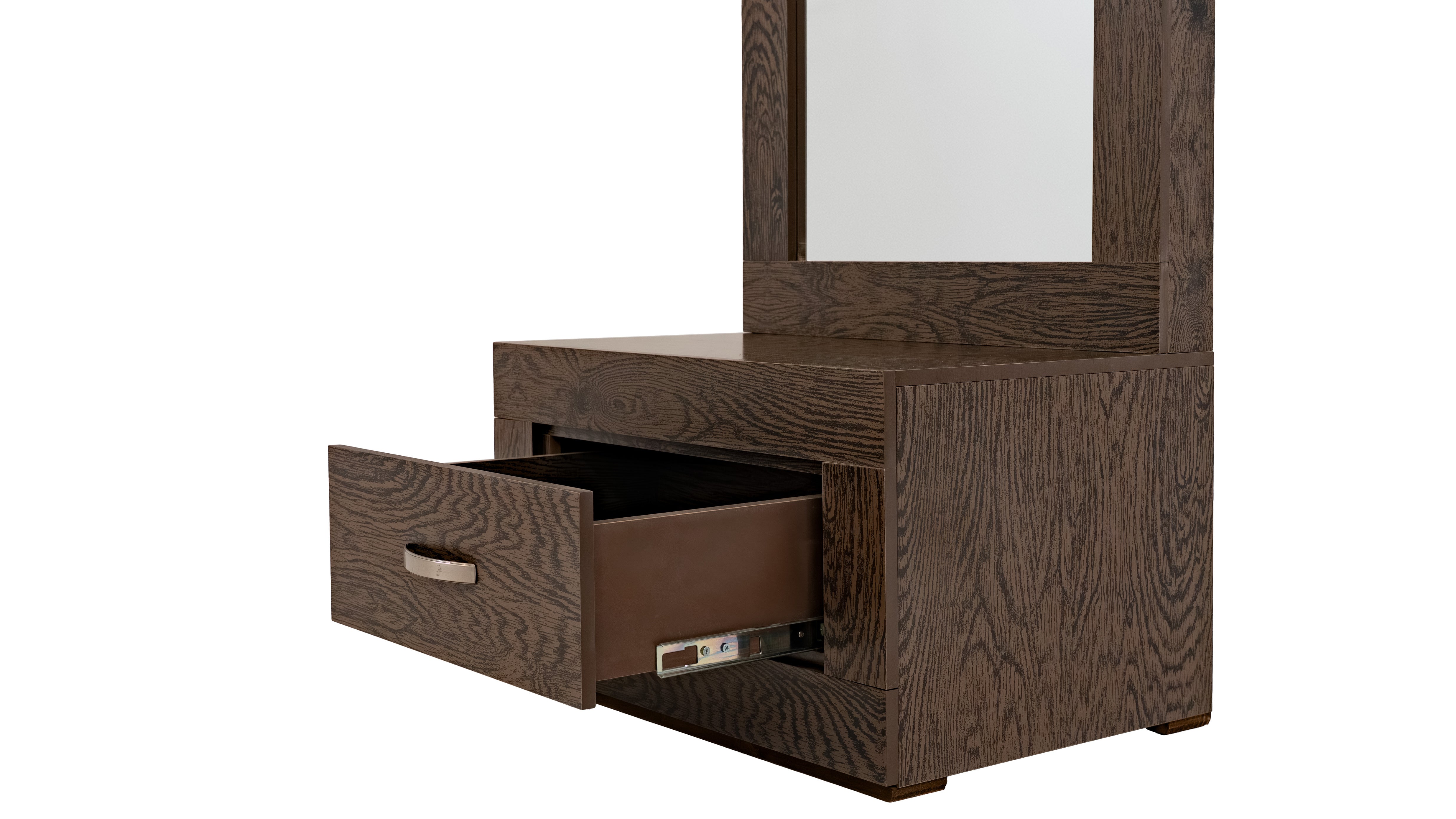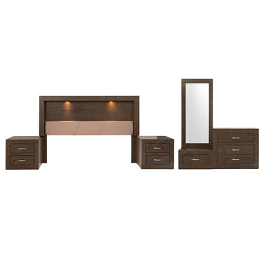 Descubre la fusión perfecta entre elegancia y diseño con este set de recámara completa, que incluye: una cabecera con luz integrada, ideal para un colchón tamaño king; dos burós, cuyo diseño versátil y almacenamiento eficiente mantienen la armonía y el orden; una cómoda y espejo que también funciona como vanity o tocador, proporcionando el espacio perfecto para maquillarse, arreglarse o simplemente prepararse para el día. Su diseño elegante y funcional aporta estilo y sofisticación al ambiente. Todos los productos fueron fabricados con materiales duraderos y un diseño atemporal. Se entregan completamente armados para un uso inmediato. Un conjunto perfecto para transformar tu dormitorio en un refugio con estilo y confort. No incluye base para cama ni colchón.