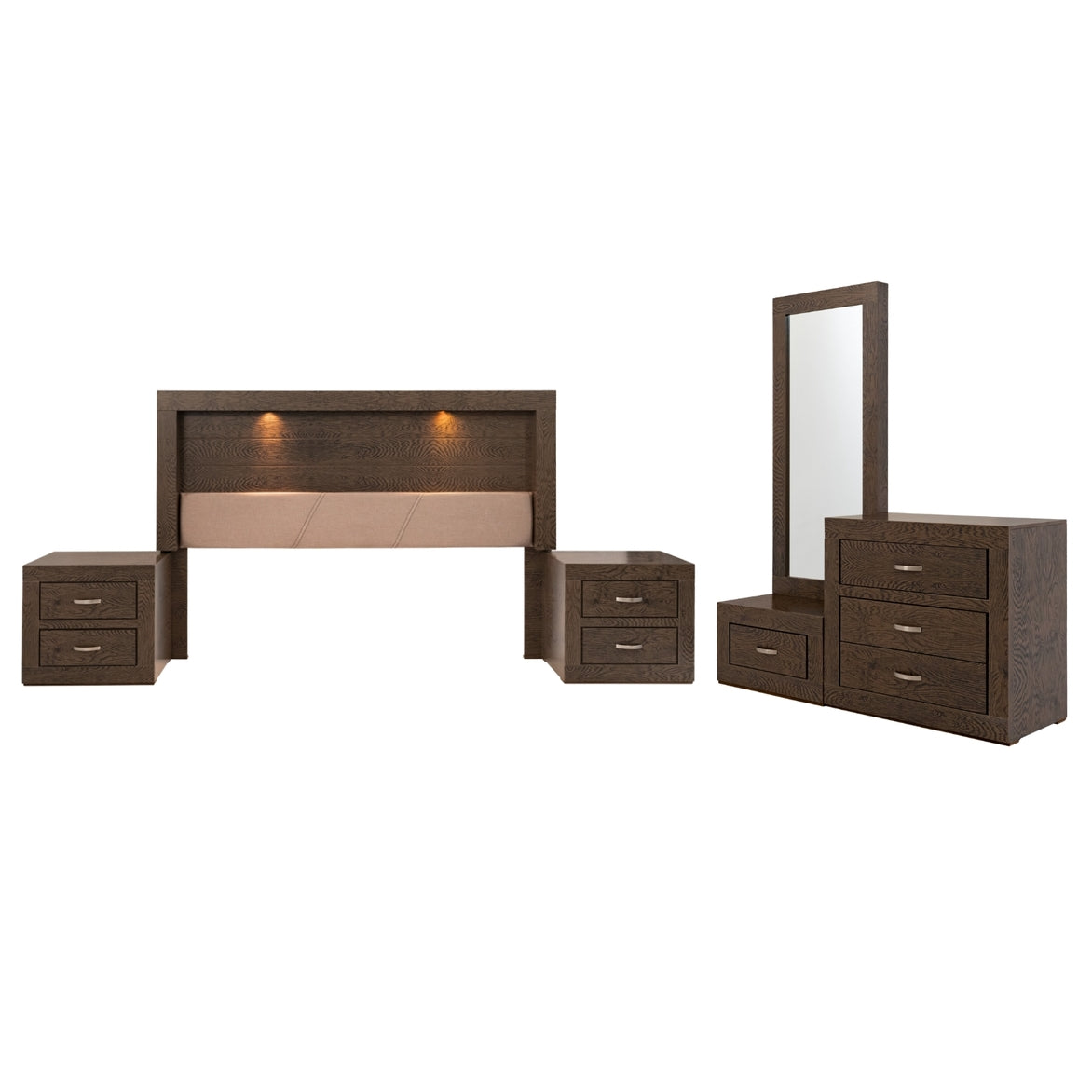 Juego de 5 piezas: incluye cabecera, dos burós, cajonera y espejo. No incluye base ni colchón. Se adapta a cualquier tamaño de base y colchón.