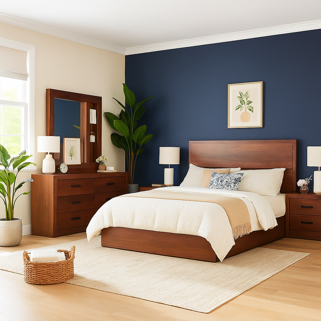 Juego de 5 piezas: incluye cabecera, dos burós, cajonera y espejo. No incluye base ni colchón. Se adapta a cualquier tamaño de base y colchón.