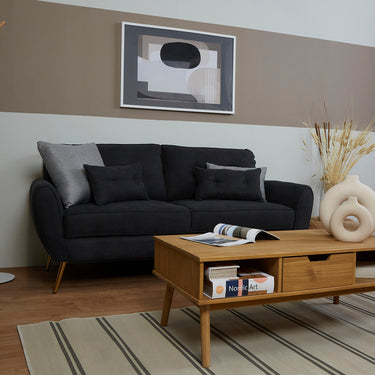 Mihaela es un sofá de 3 plazas con un seductor diseño retro. Estructura de madera de pino de primera, horneada y sin nudos. Las patas son de metal. Densidad del cojín de 24 Kg de hule espuma. La tela contiene fibras de poliéster para mayor comodidad. El sofá viene armado a excepción de las patas que se atornillan de manera fácil y amigable.
