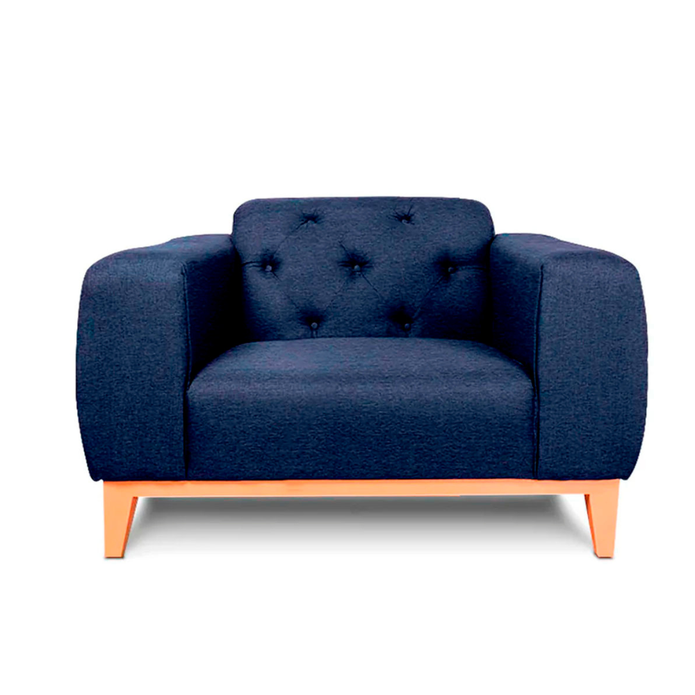 Estructura de madera de pino de primera, horneada y sin nudos. Las patas son de pino natural. Densidad del cojín de 22 Kg de hule espuma. La tela es de algodón y contiene fibras de poliéster para mayor comodidad. El sillón viene armado a excepción de las patas que se atornillan de manera fácil y amigable.