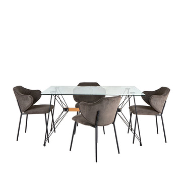 Mesa de cristal templado con patas de metal y soporte de madera. 4 sillas con respaldo y asiento de tela. Base con estructura metálica y patas efecto madera natural