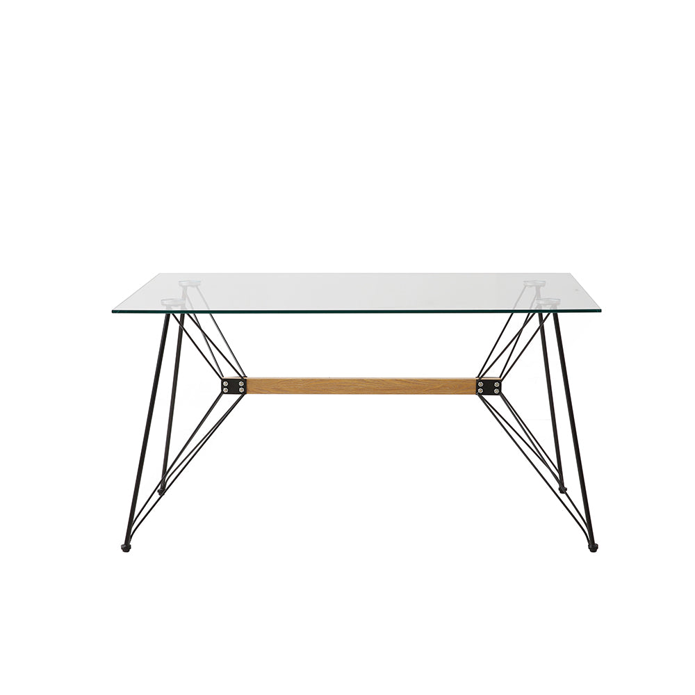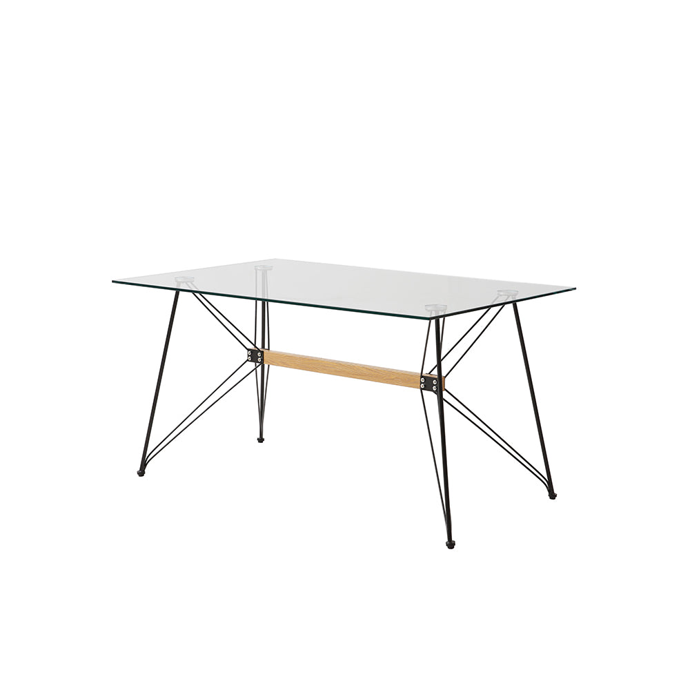 Mesa de cristal templado con patas de metal y soporte de madera. 4 sillas con respaldo y asiento en tercioeplo. Base con estructura metálica y patas efecto madera natural