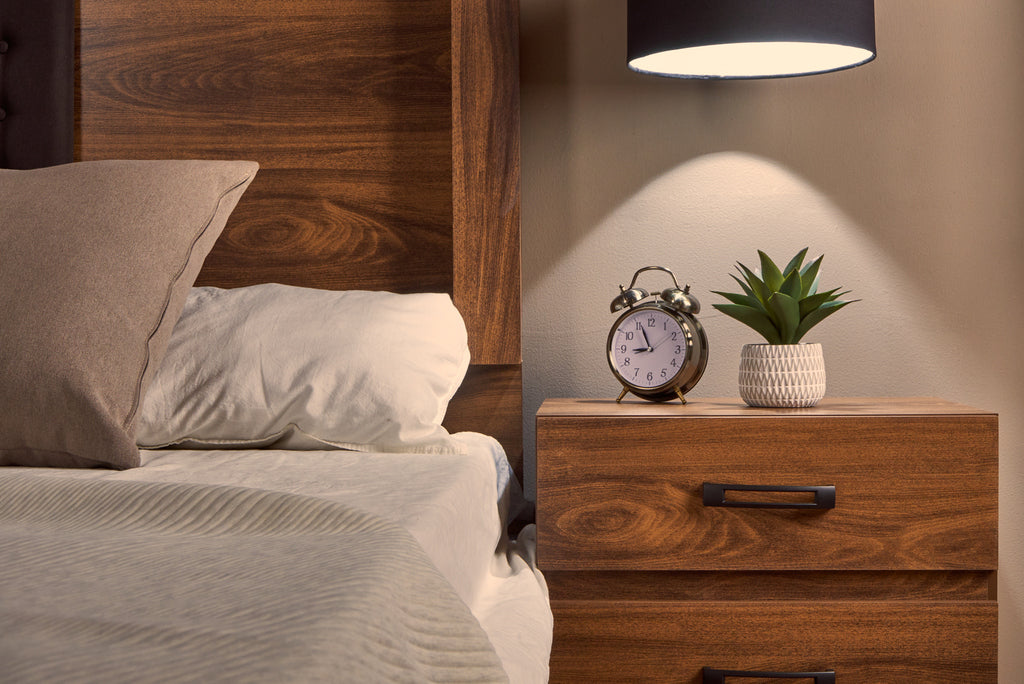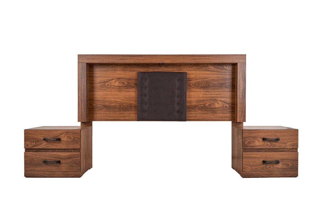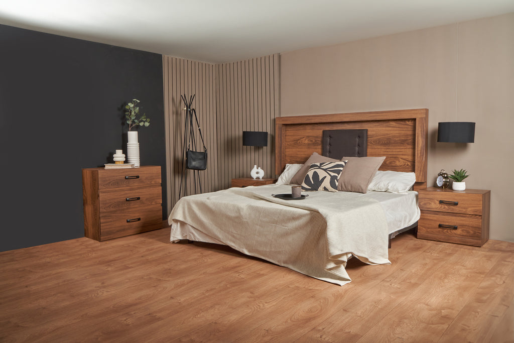 Juego de 4 piezas: incluye cabecera, dos burós y cómoda. No incluye base ni colchón. Se adapta a cualquier tamaño de base y colchón.