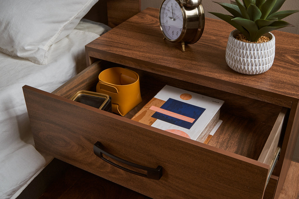 Recámara de 4 piezas en color nogal. Incluye cabecera, 2 Burós, Cómoda. Se adapta a cualquier medida de base y colchón. Se entrega armada. No incluye base ni colchón.