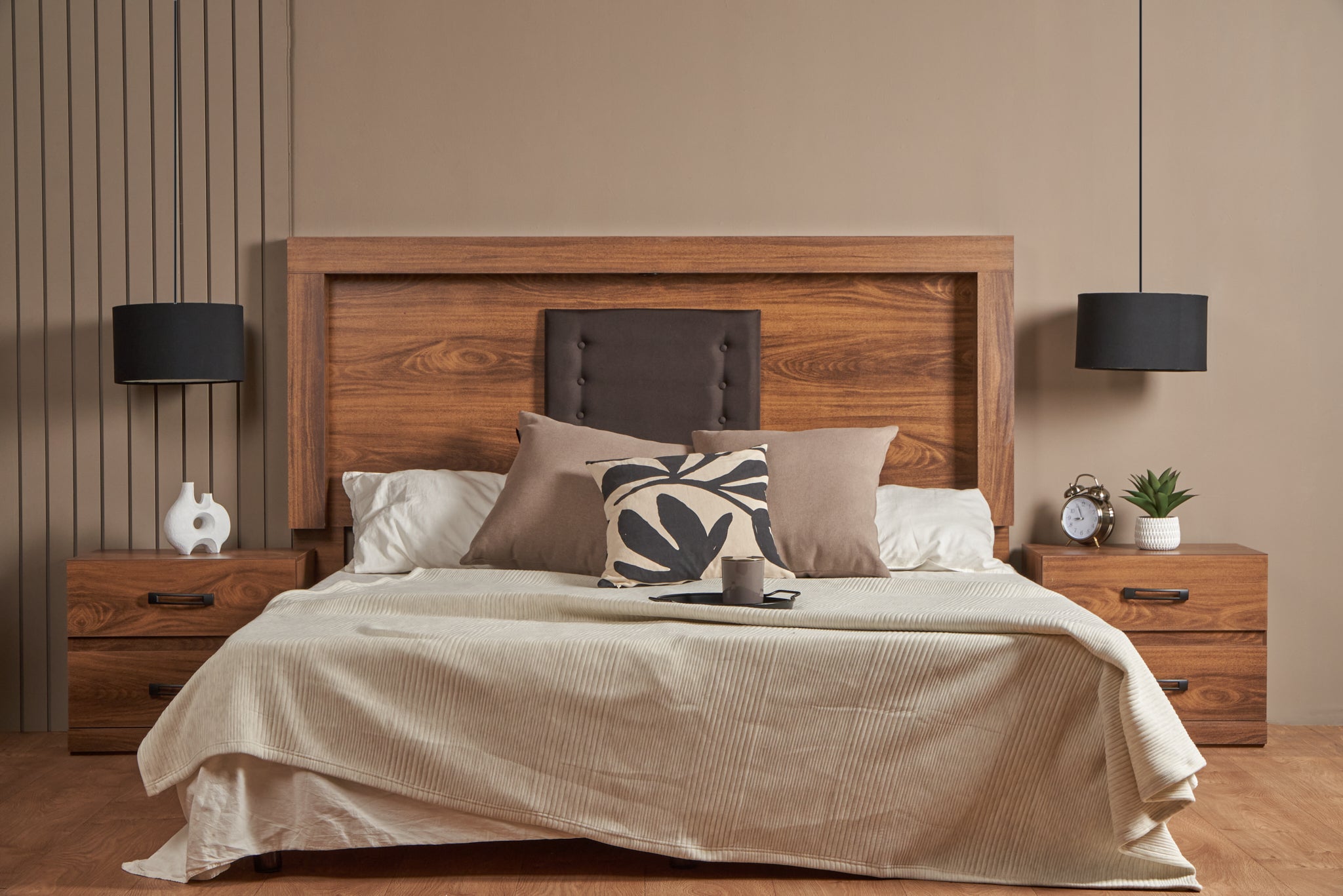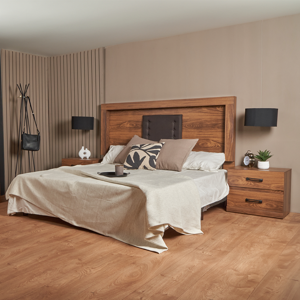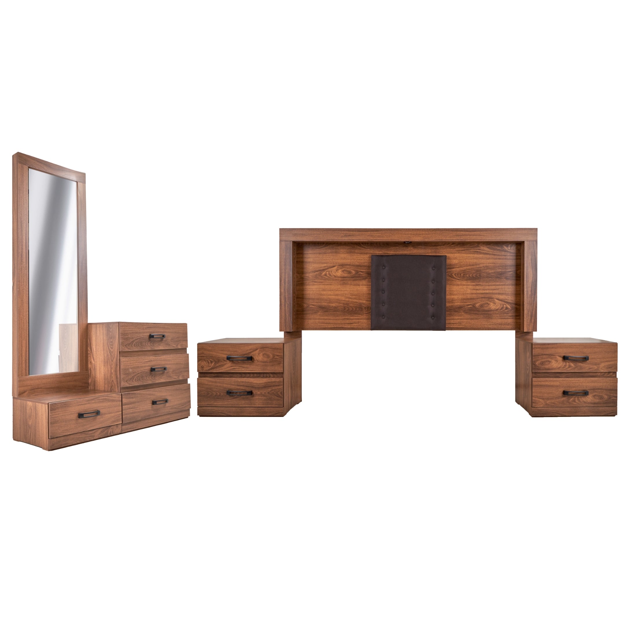 Juego de 5 piezas: incluye cabecera, dos burós, cajonera y espejo. No incluye base ni colchón. Se adapta a cualquier tamaño de base y colchón.