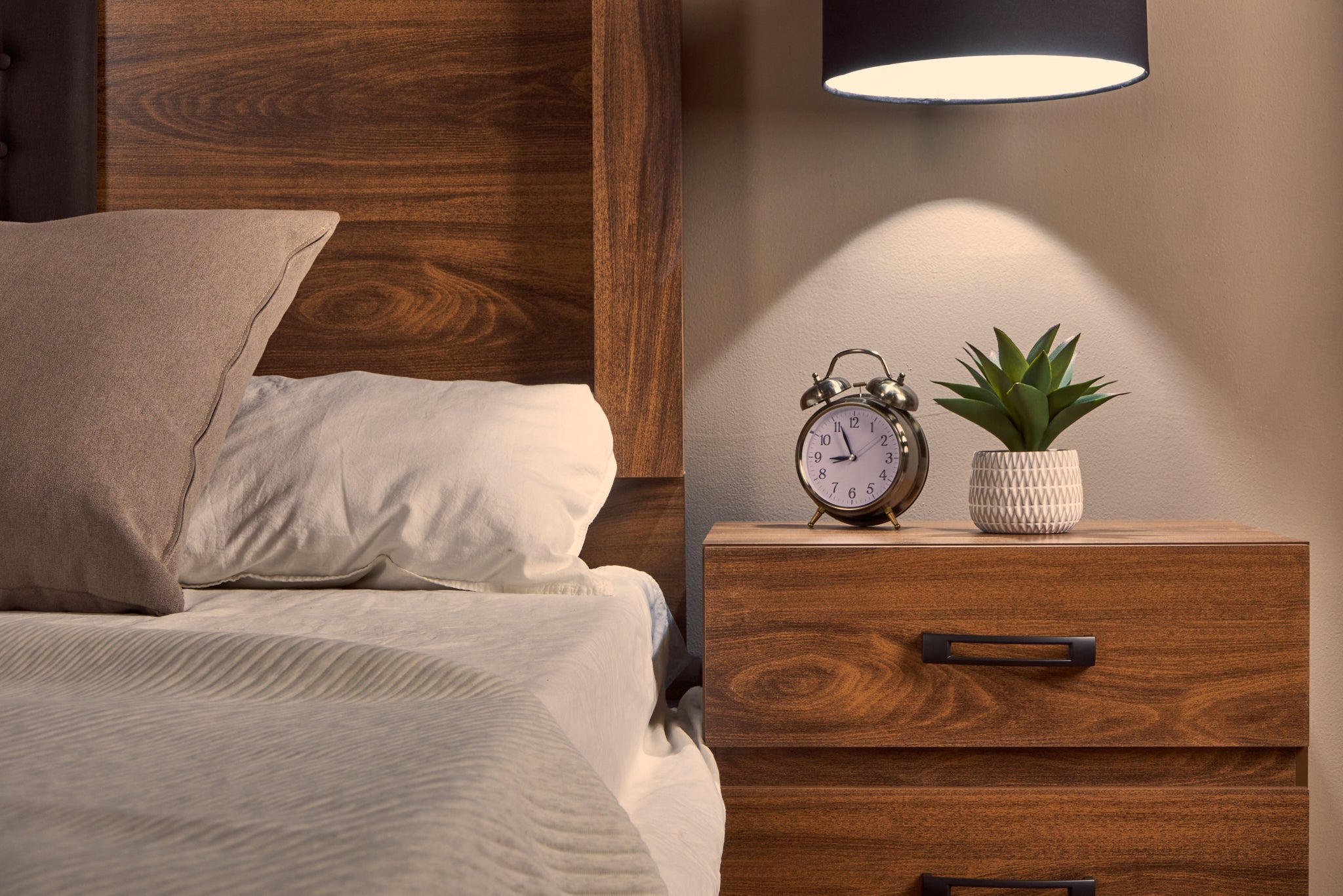 Recámara de 5 Piezas con Cabecera, 2 Burós, Cajonera y Espejo Color Nogal. Se entrega armado. No incluye base ni colchón.