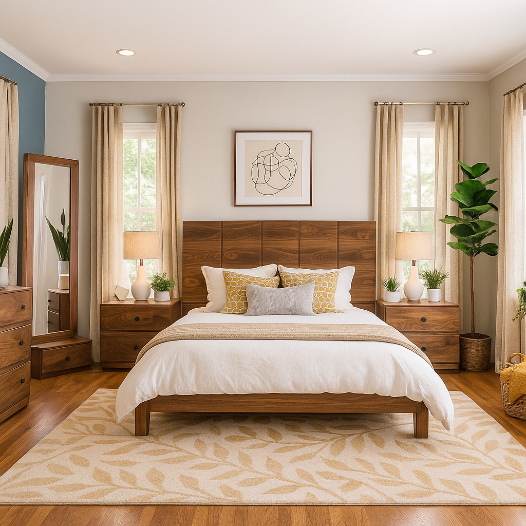 Juego de 5 piezas: incluye cabecera, dos burós, cajonera y espejo. No incluye base ni colchón. Se adapta a cualquier tamaño de base y colchón.