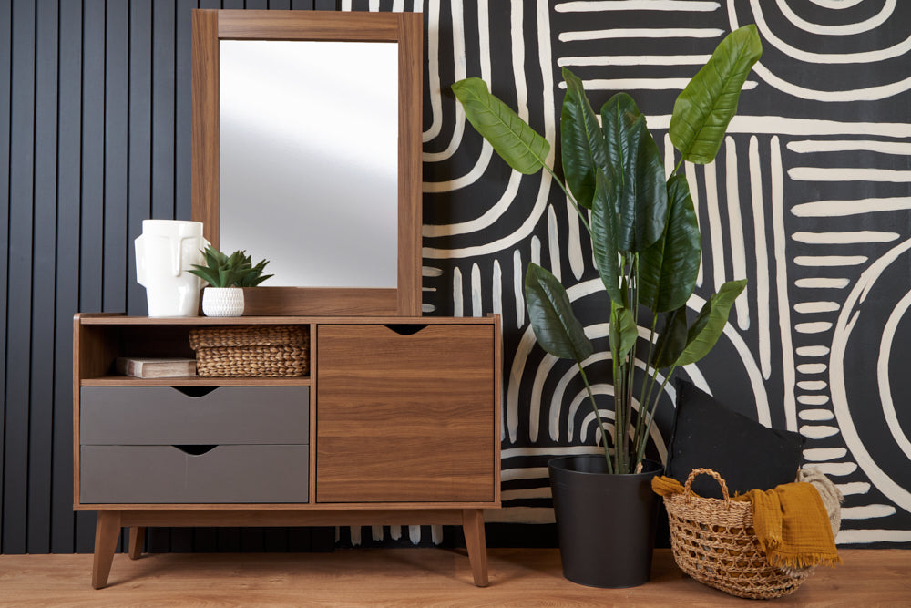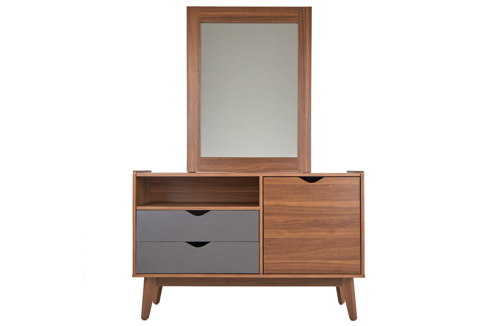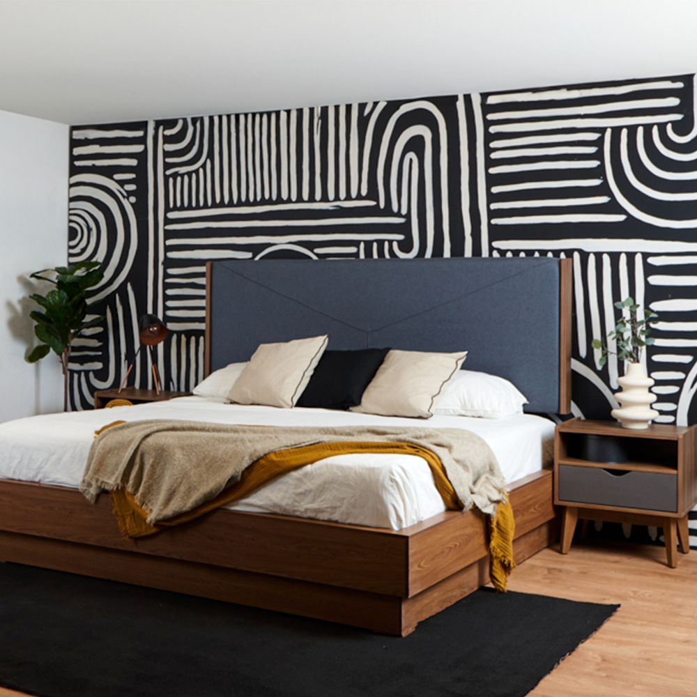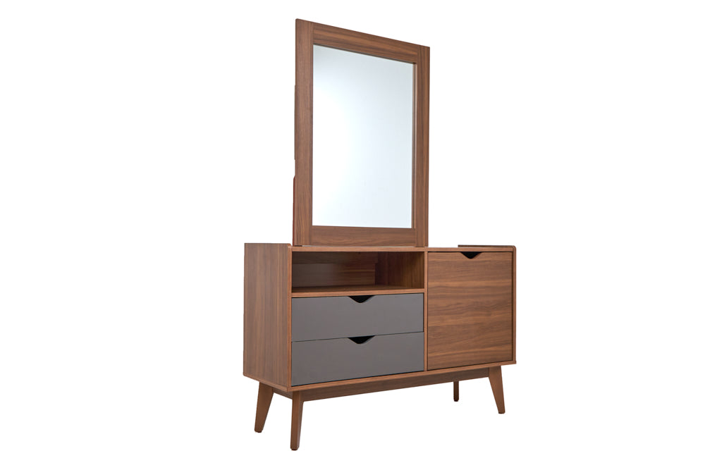 Juego de 5 piezas: incluye cabecera, dos burós, cajonera y espejo. No incluye base ni colchón. Se adapta a cualquier tamaño de base y colchón.