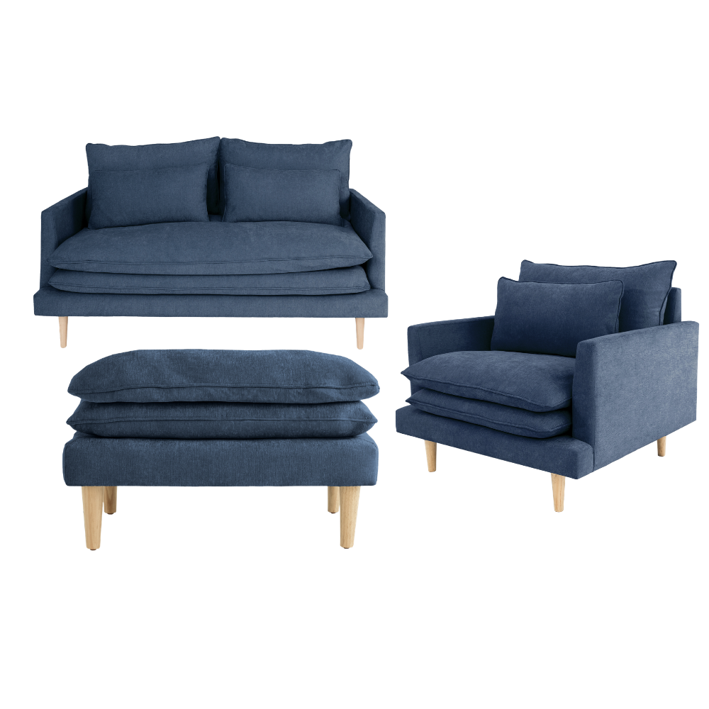 Sala con 1 sillón, 1 sofá de 2 plazas y 1 taburete Color Azul Marino