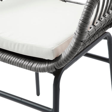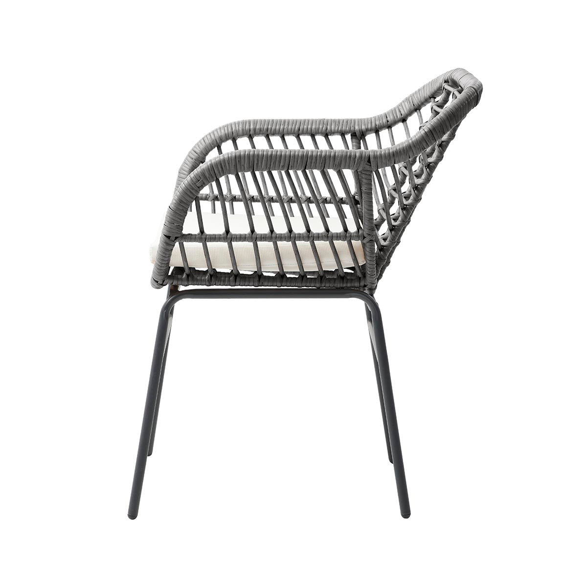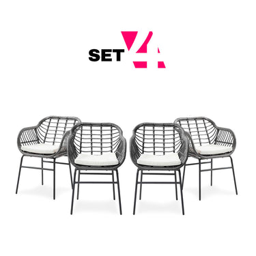Juego de 4 sillas de ratán sintético para exterior con armazón de acero pintado en color negro. Incluye un cojín en tejido acrílico impermeable.