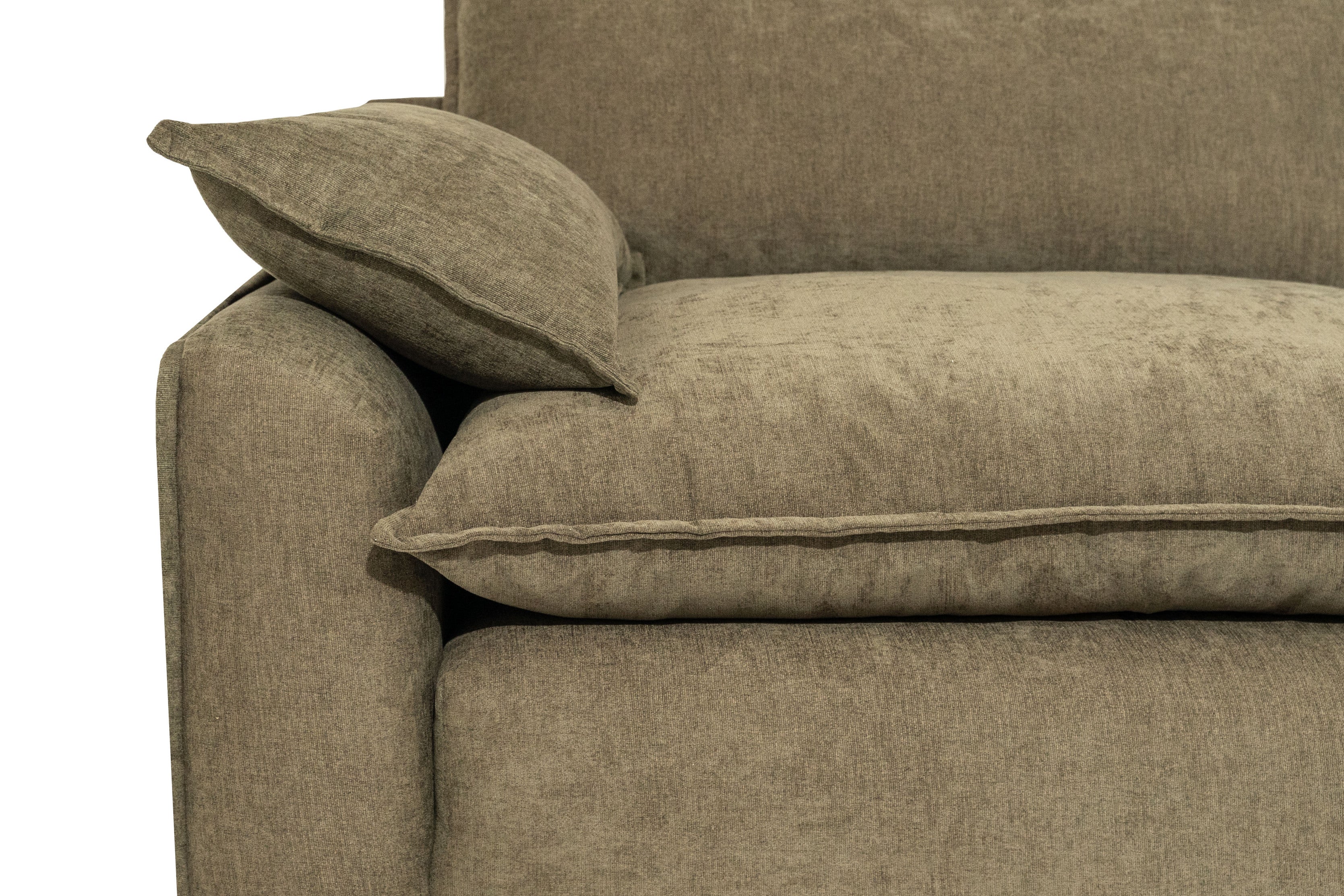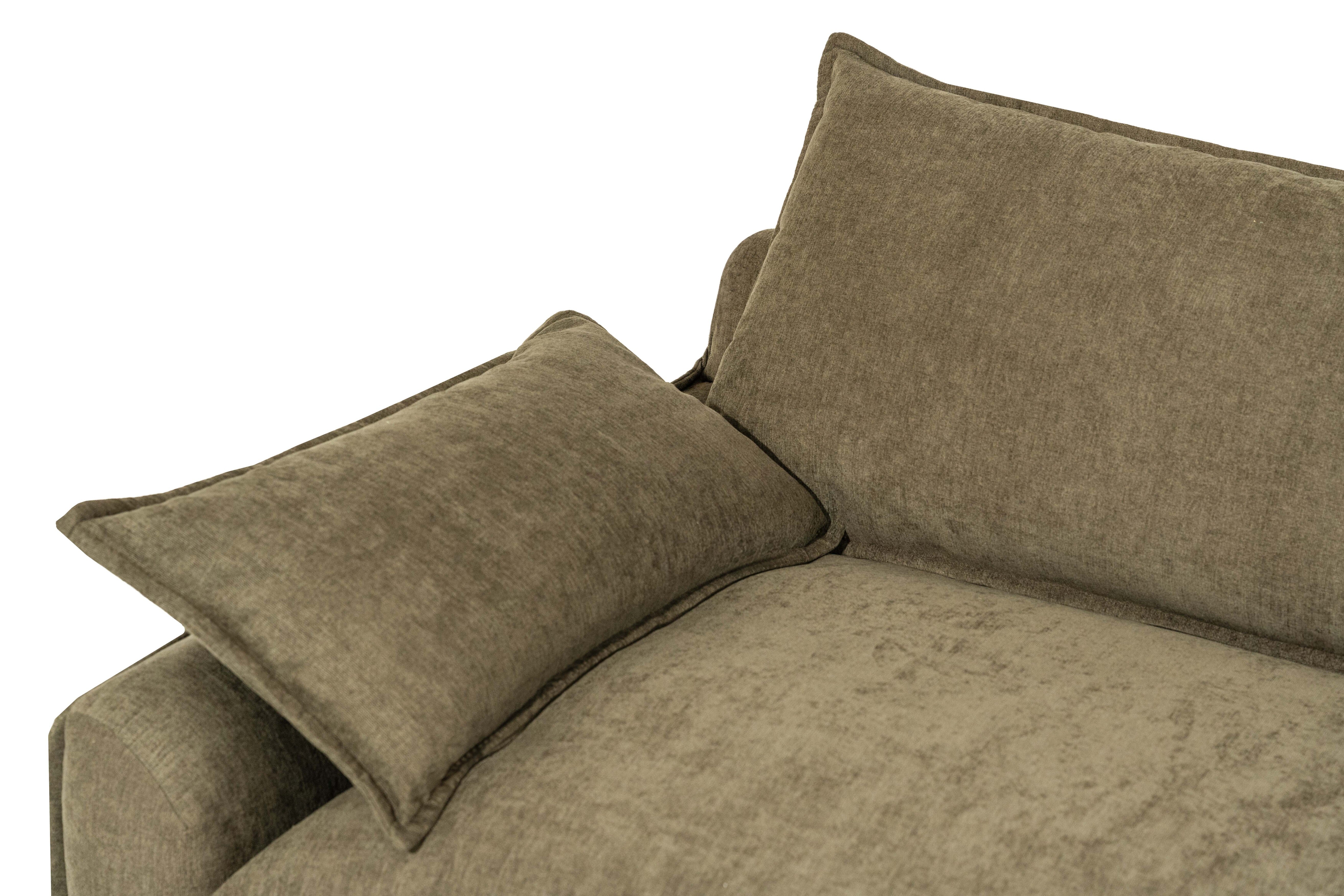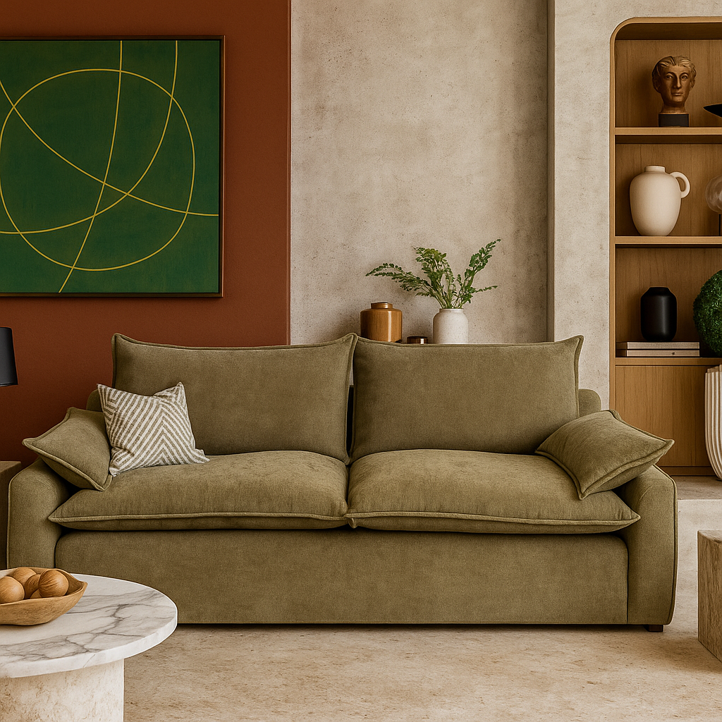 Sofá de 3 Plazas Acolchado en Hule Espuma y Fibra Down Color Verde Olivo. Estructura de Madera Sólida